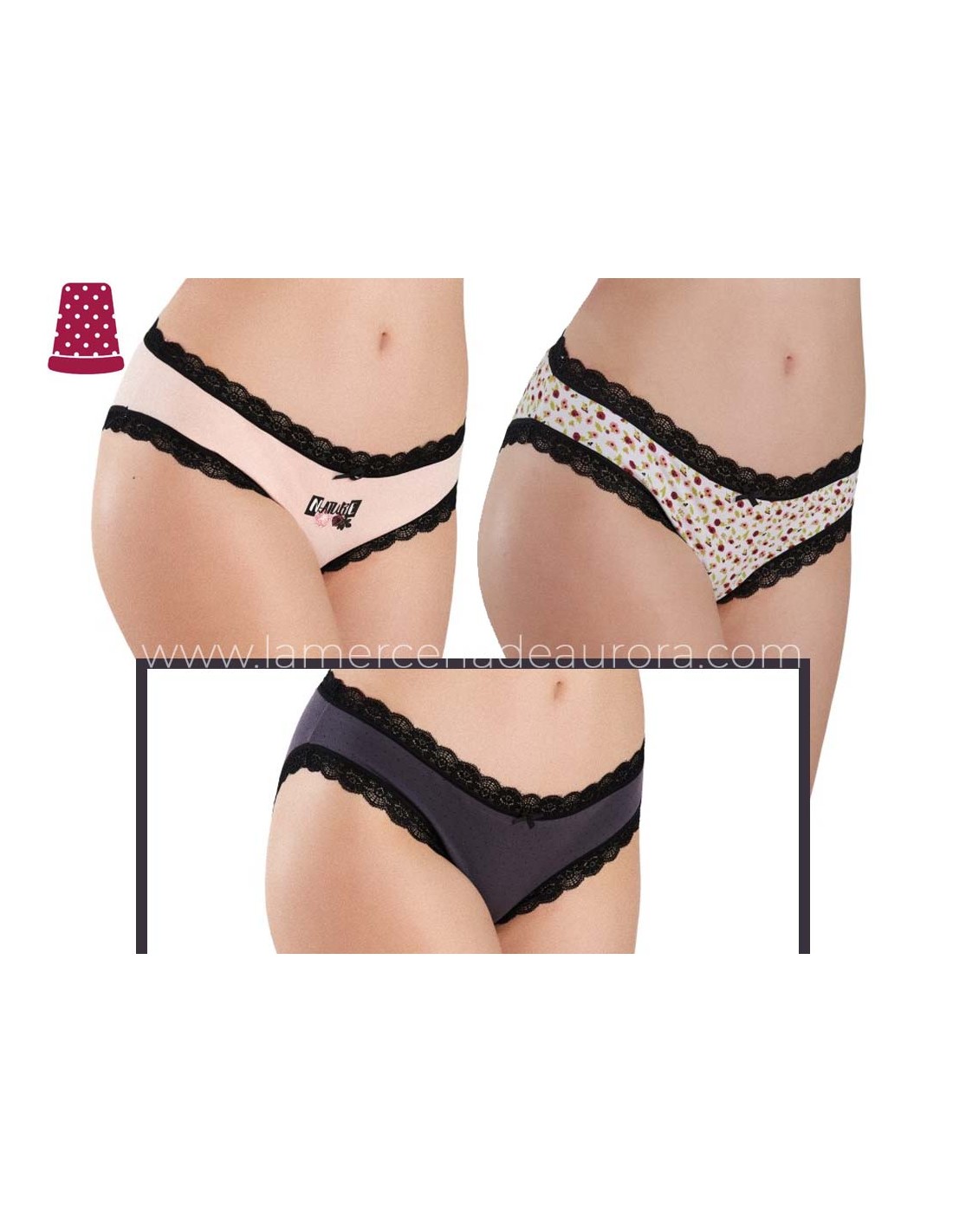 Pack con tres braguitas mujer fantasía con blonda negra en cintura y camales.