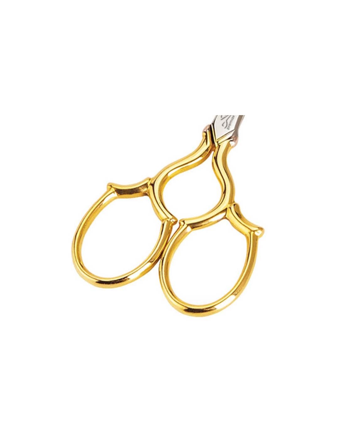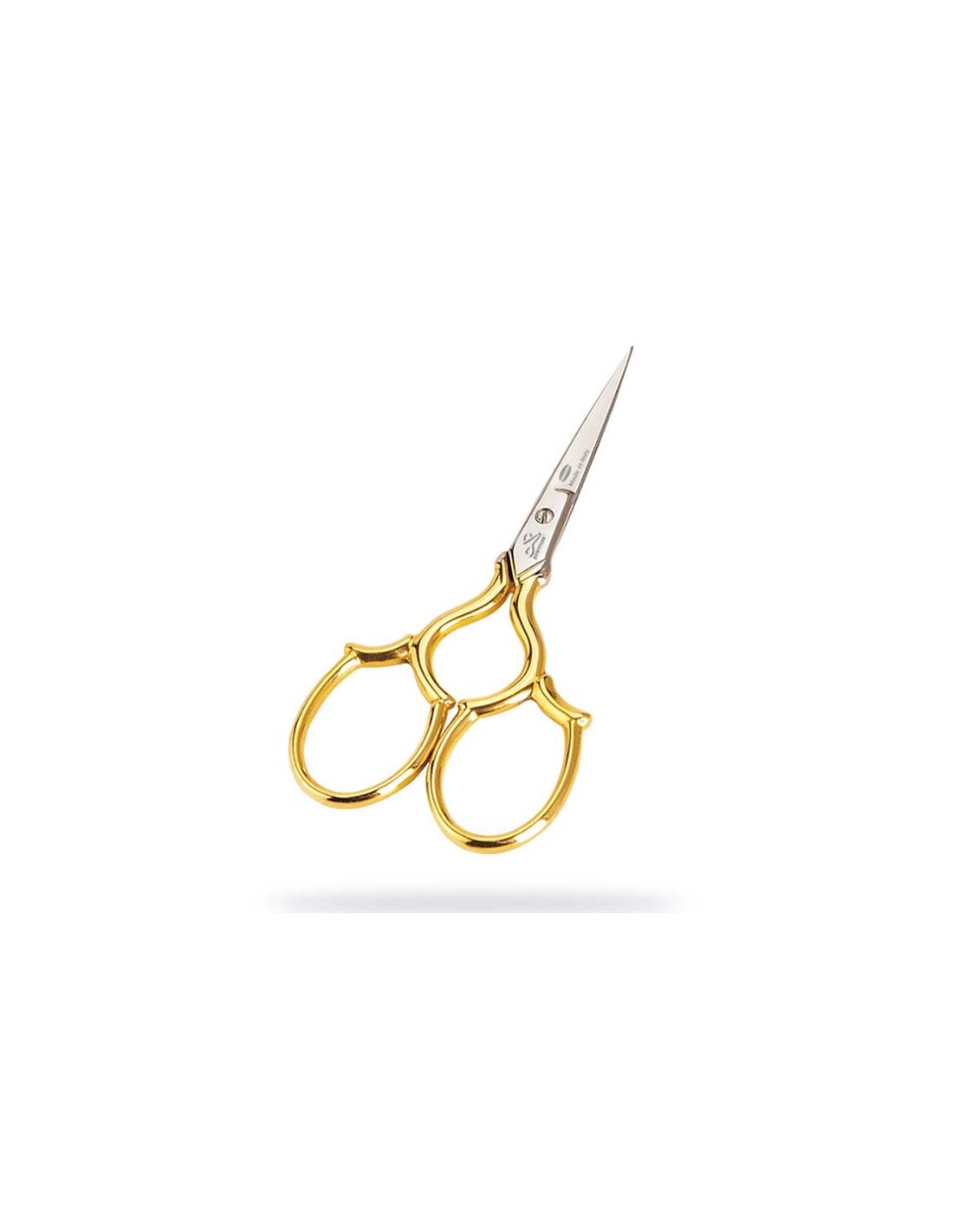 Elegante tijera para bordar con mangos fantasía y punta recta, fabricada con acero al carbono niquelado y embellecida en los mangos con un baño dorado de 24 quilates.