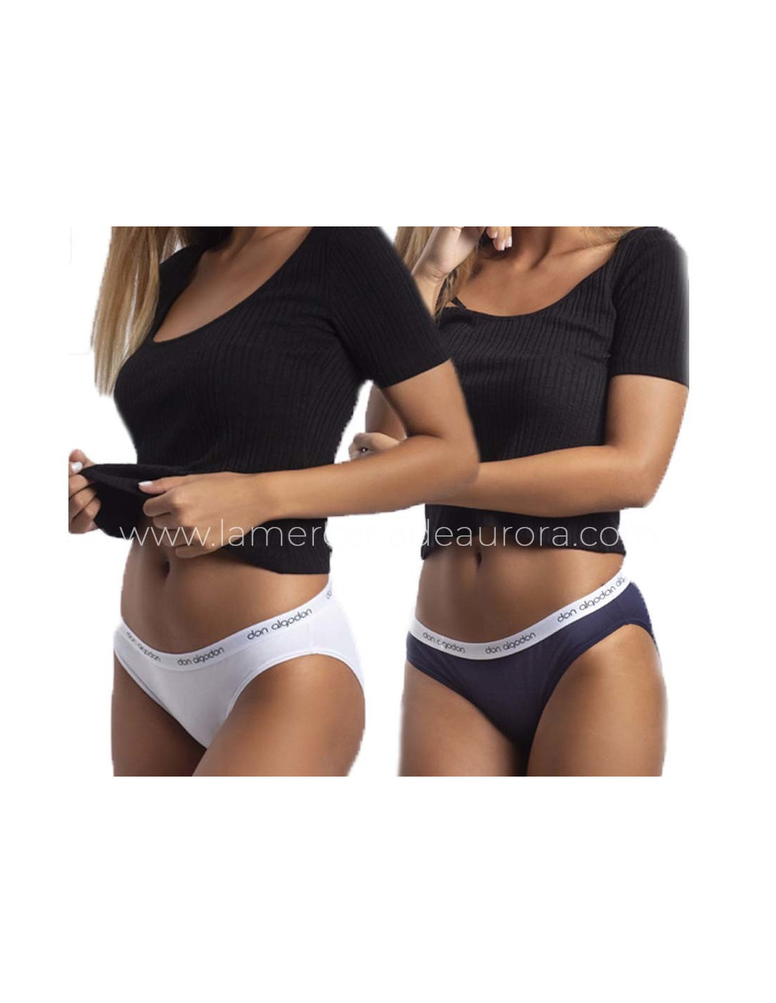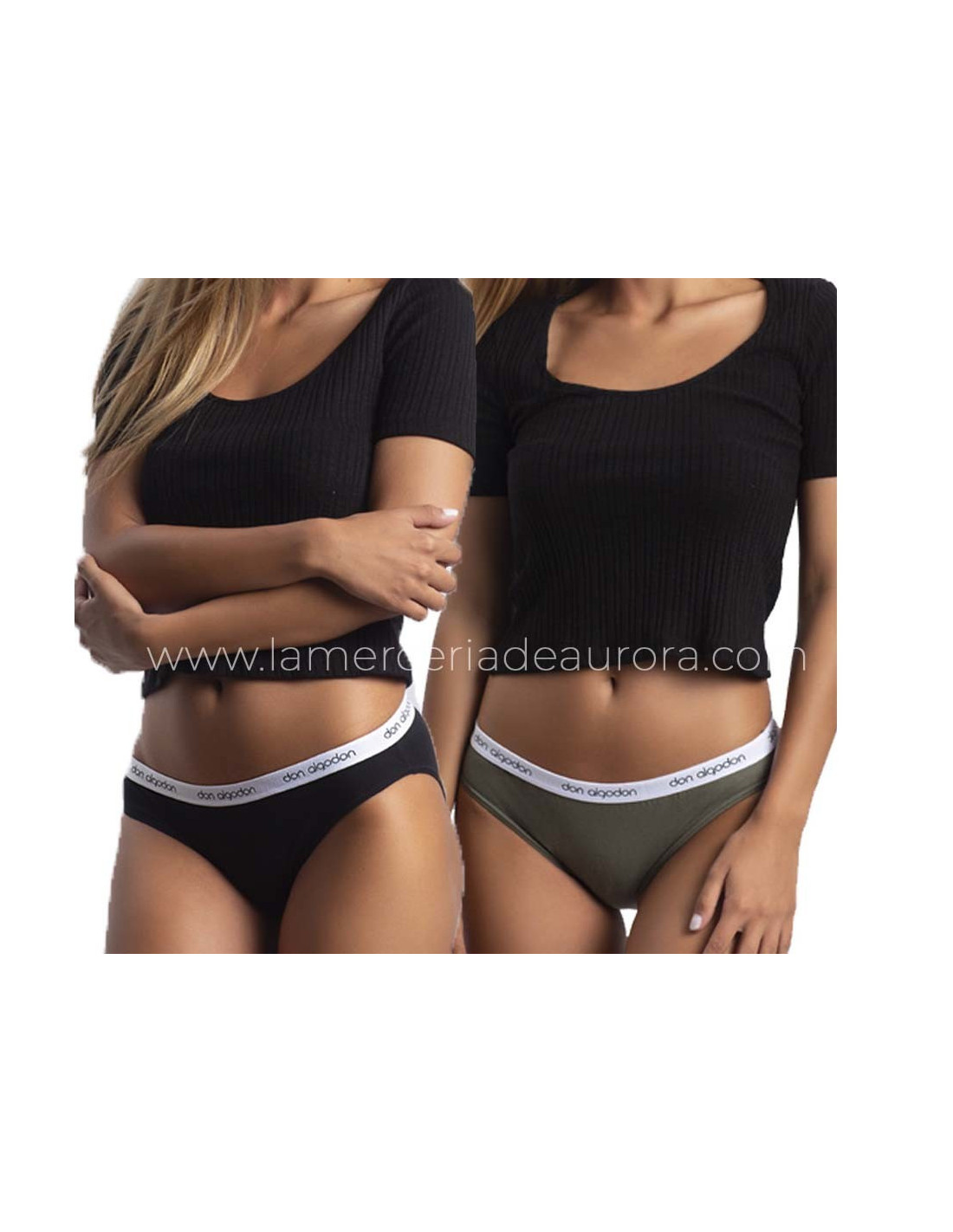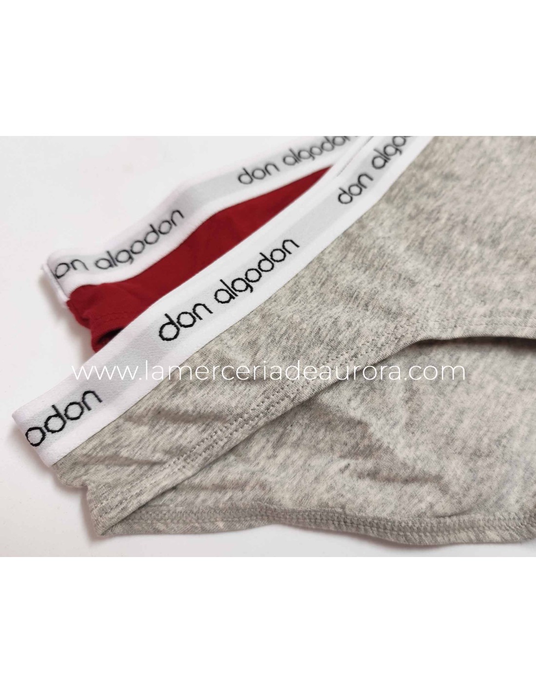 Las braguitas se presentan pack de dos unidades, en colores surtidos (gris/granate, negra/verde y blanca/marino).