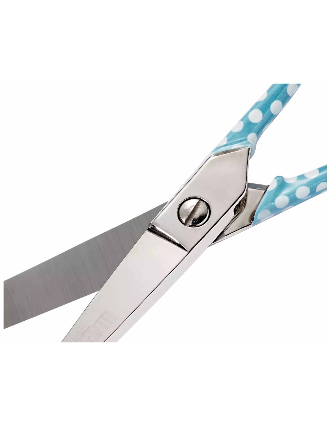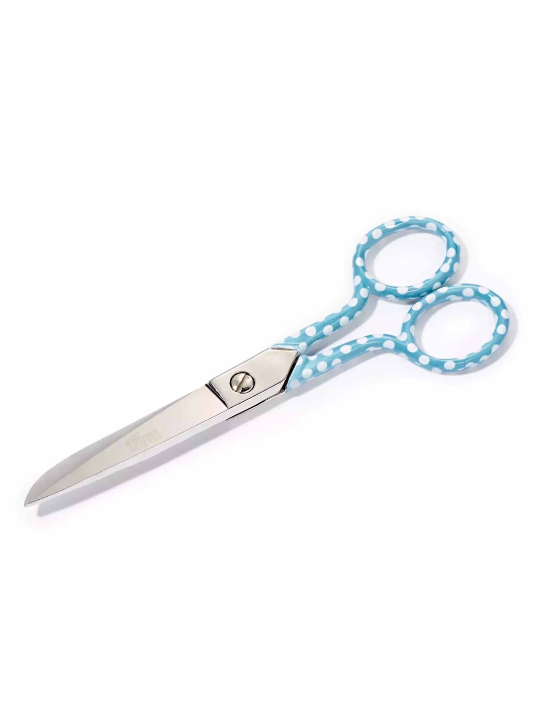 Tijera de costura de primera calidad, de la colección PRYM LOVE esmaltada en los mangos en color turquesa con topos en color blanco.