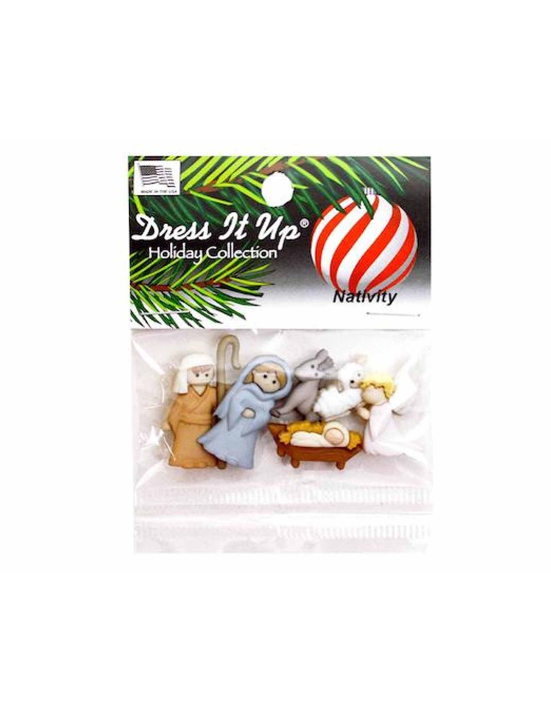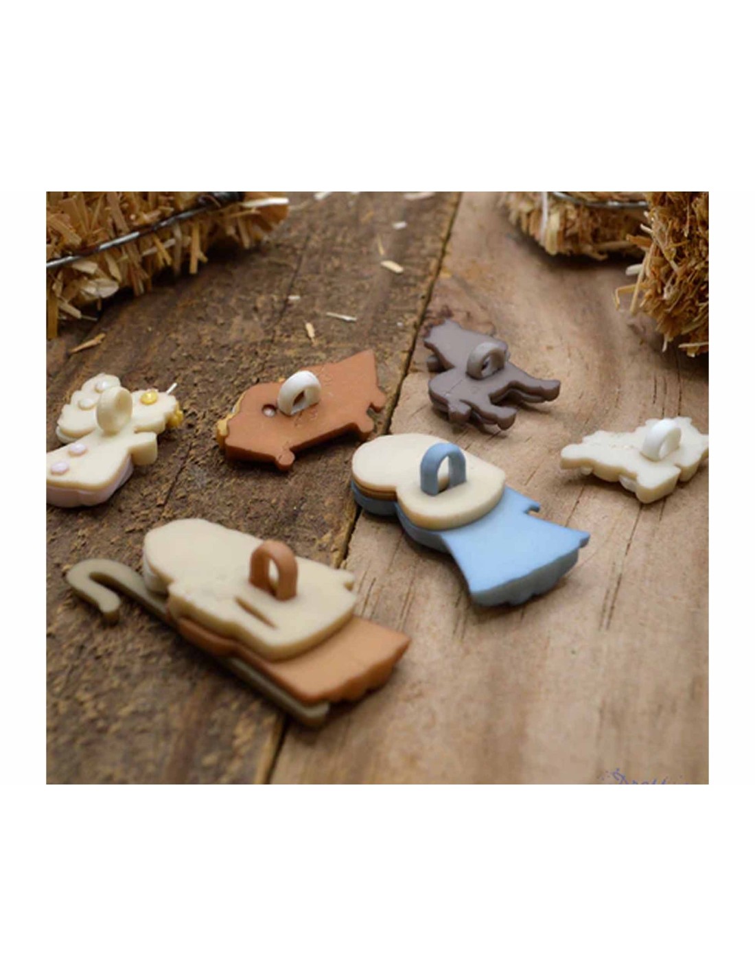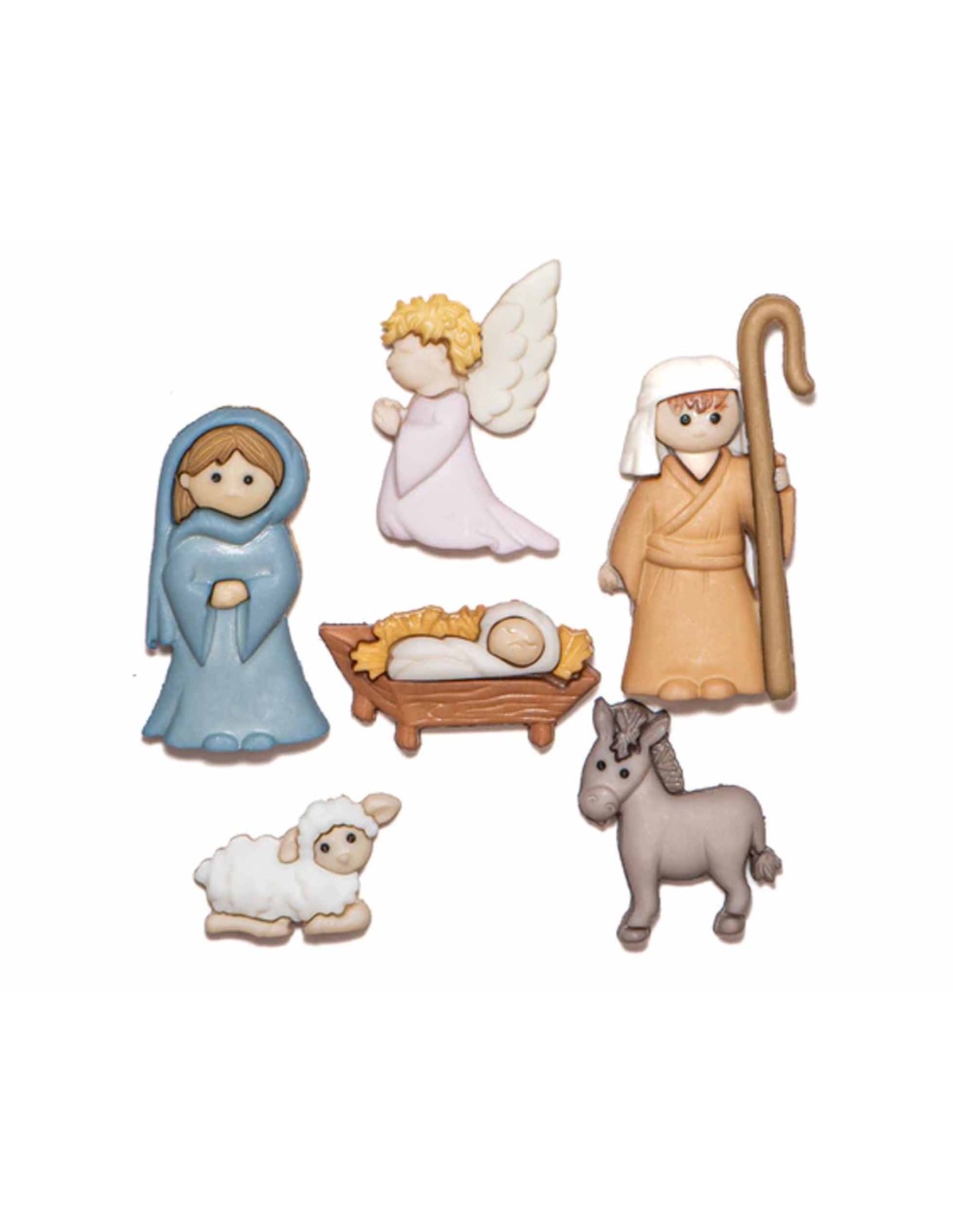 Pack 6 botones fantasía decorativos "Nativity". Con las imágenes de LA VIRGEN MARÍA, SAN JOSÉ, EL ÁNGEL, LA OVEJA y EL BURRO.
