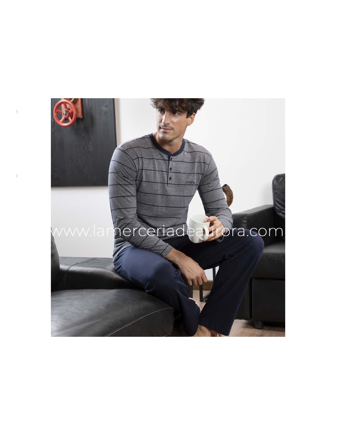Camiseta de manga larga, con cuello redondo y tapeta con botones. En azul marino, a rayas.
