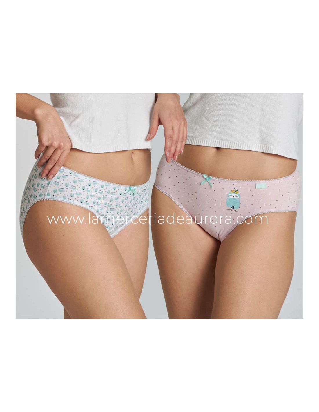 Una braga en verde agua, con mini-corazones y un perezoso en el lado izquierdo. La otra en blanca totalmente estampada con pequeños perezosos.