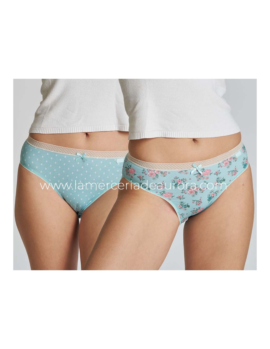 Las dos braguitas con fondo verde agua, una con pequeños tulipanes blancos y la otra con ramilletes de flores.