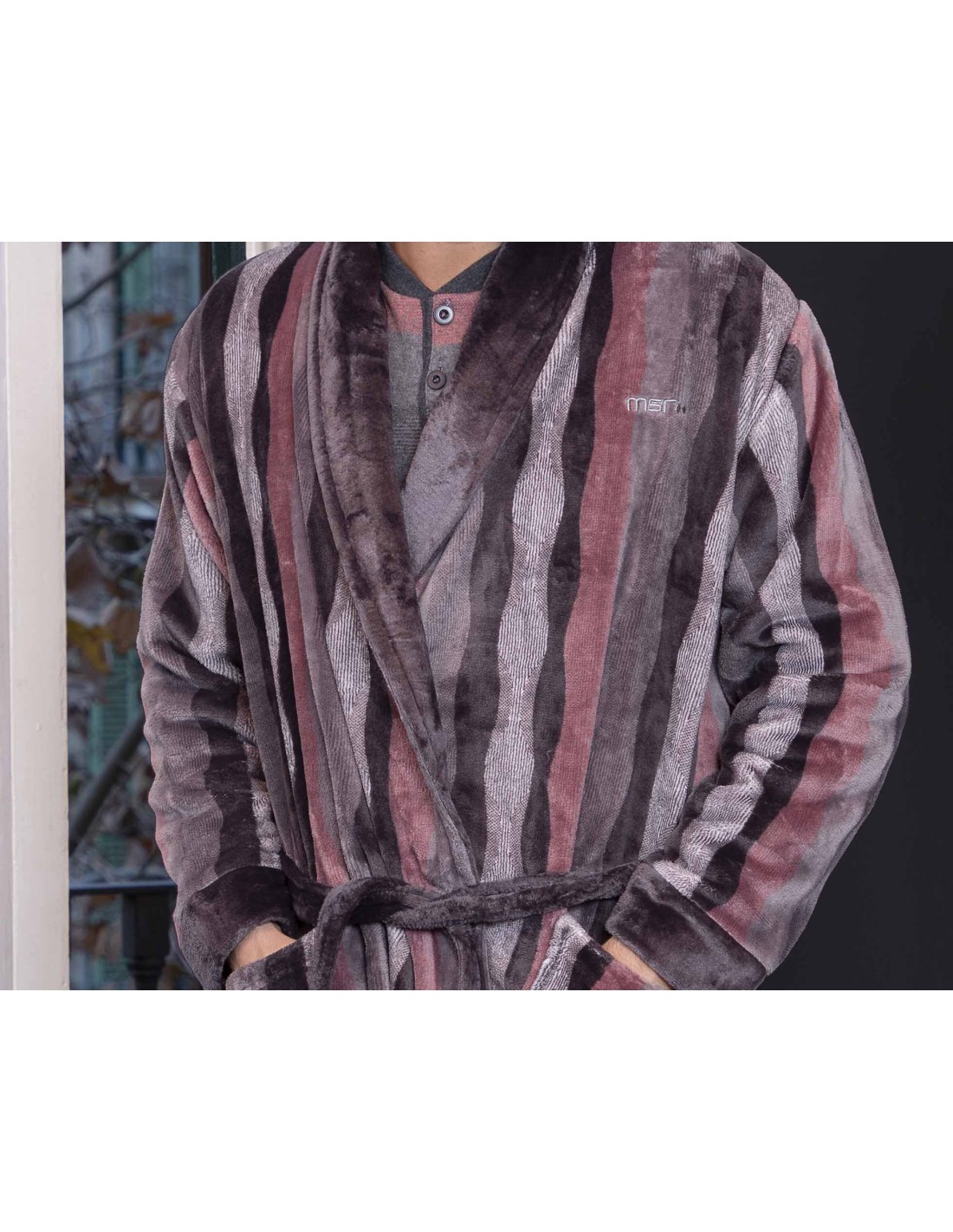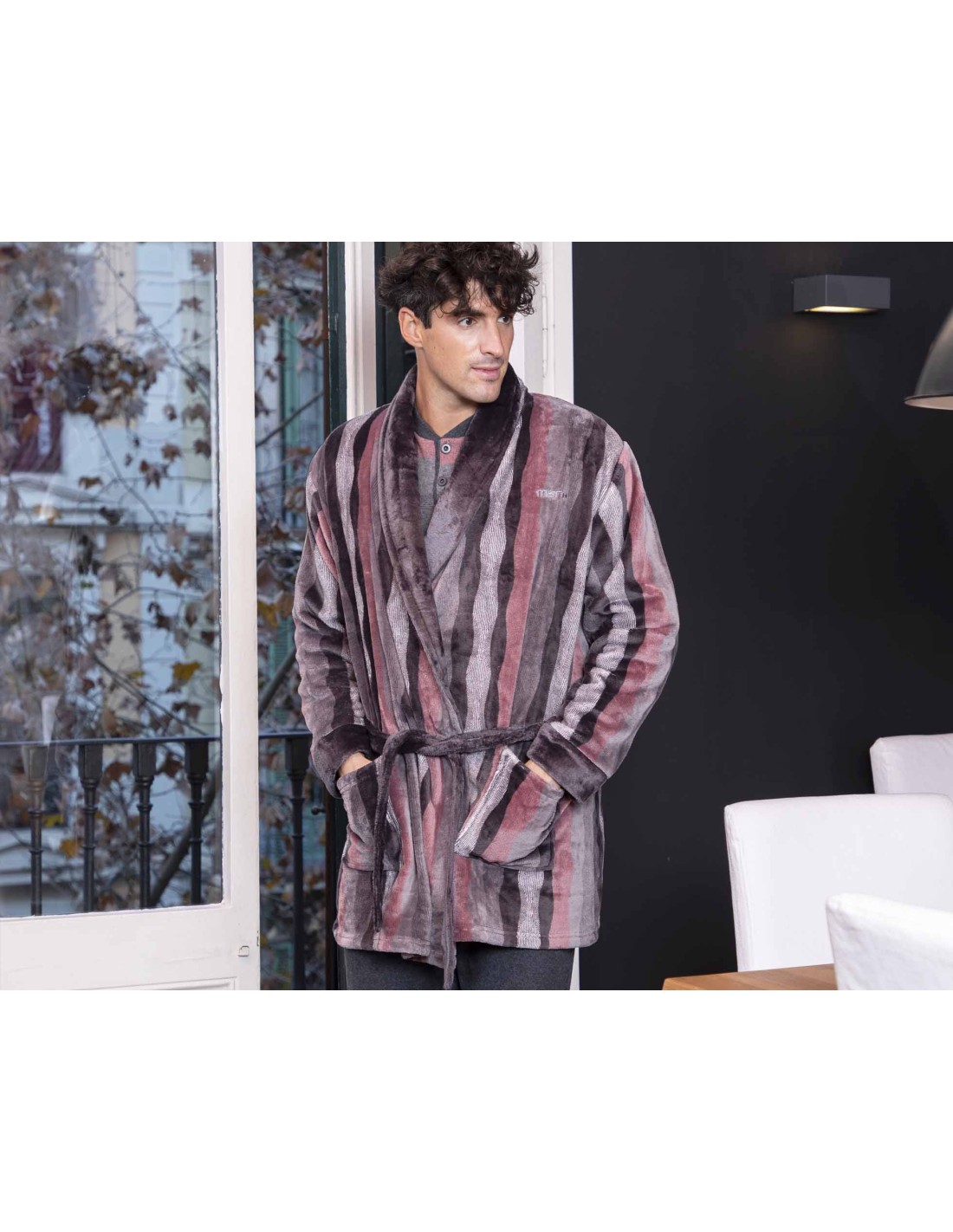 En varios tonos de gris y burdeos. El cuello, el cinturón, los puños y el detalle de los bolsillos, van en gris.