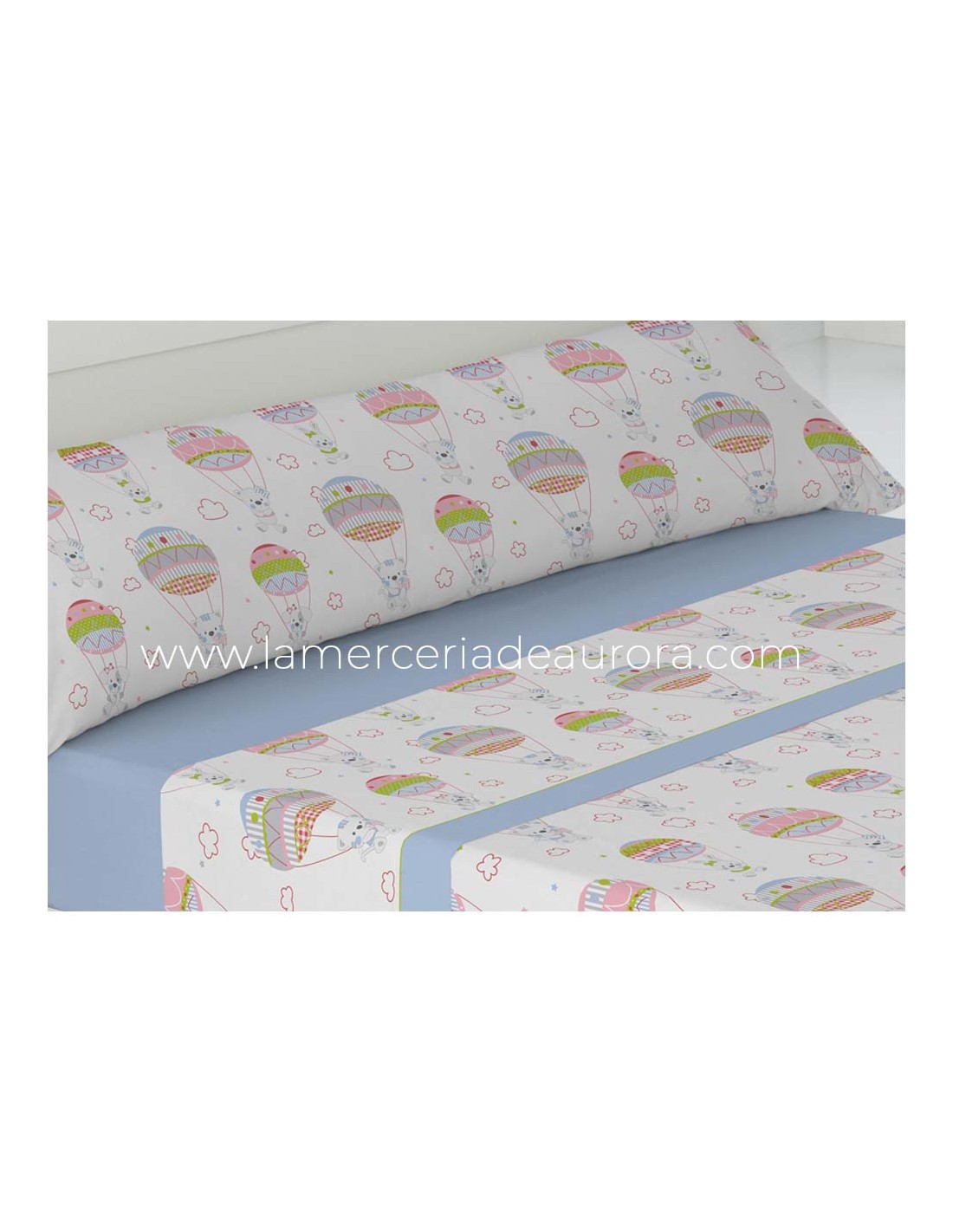 Bajera azul y encimera y funda de almohada en marfil, estampadas con simpáticos ositos en globos aerostáticos.