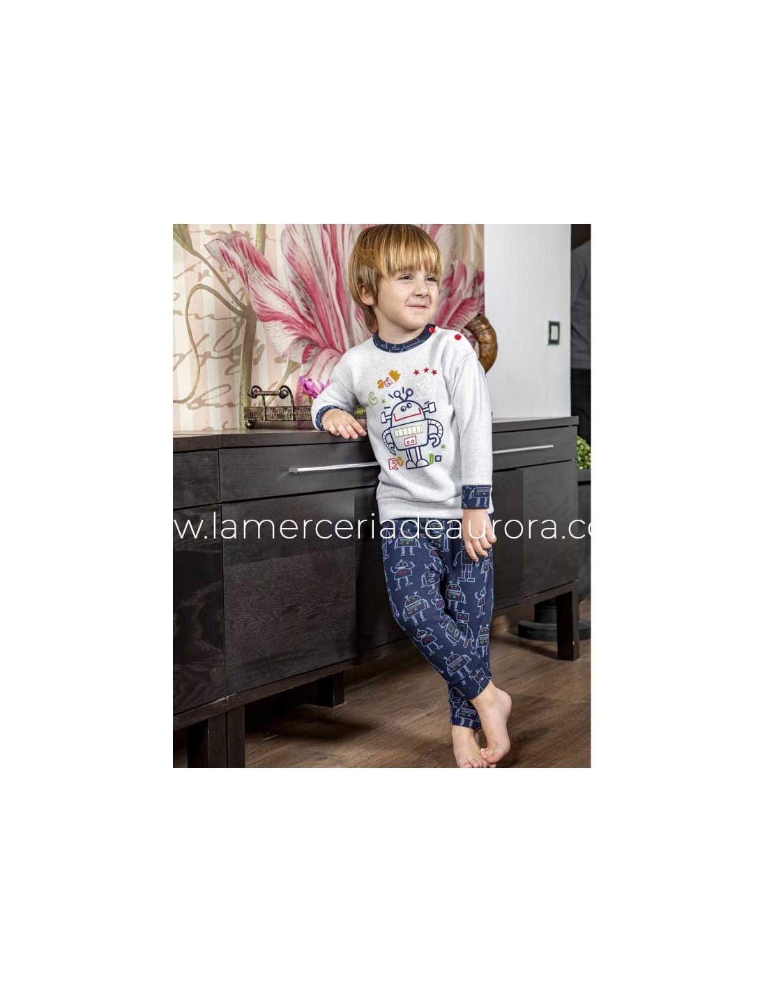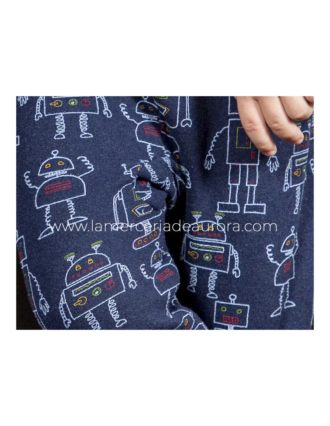 Pantalón largo, en marino, estampado con robots. Con puños. Cintura con goma.