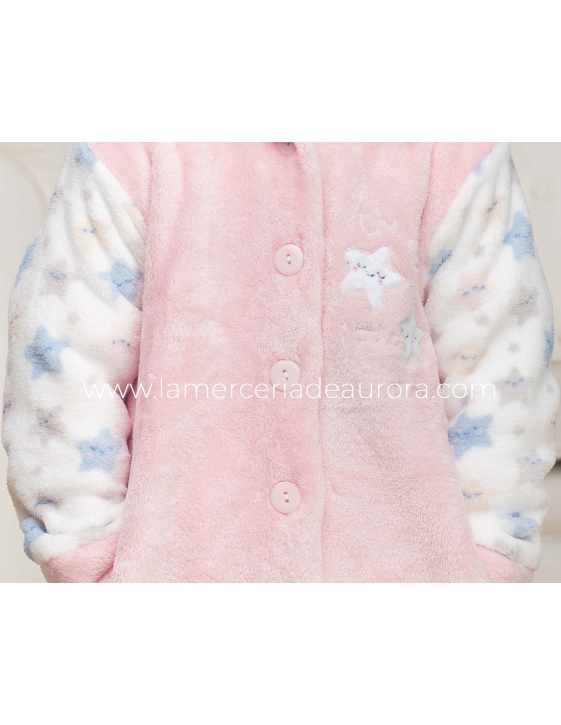 En color rosa, con aplique bordado de estrellitas en uno de los lados. Mangas y cuello en marfil, estampado con estrellas. Bolsillos laterales. Se abrocha con botones.