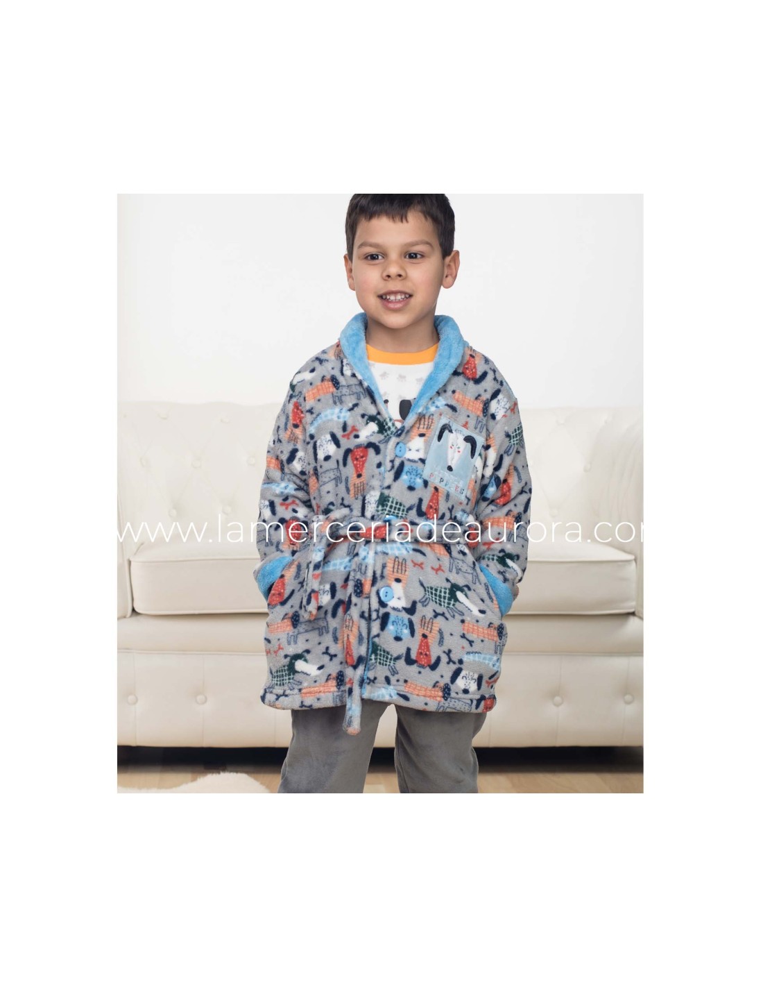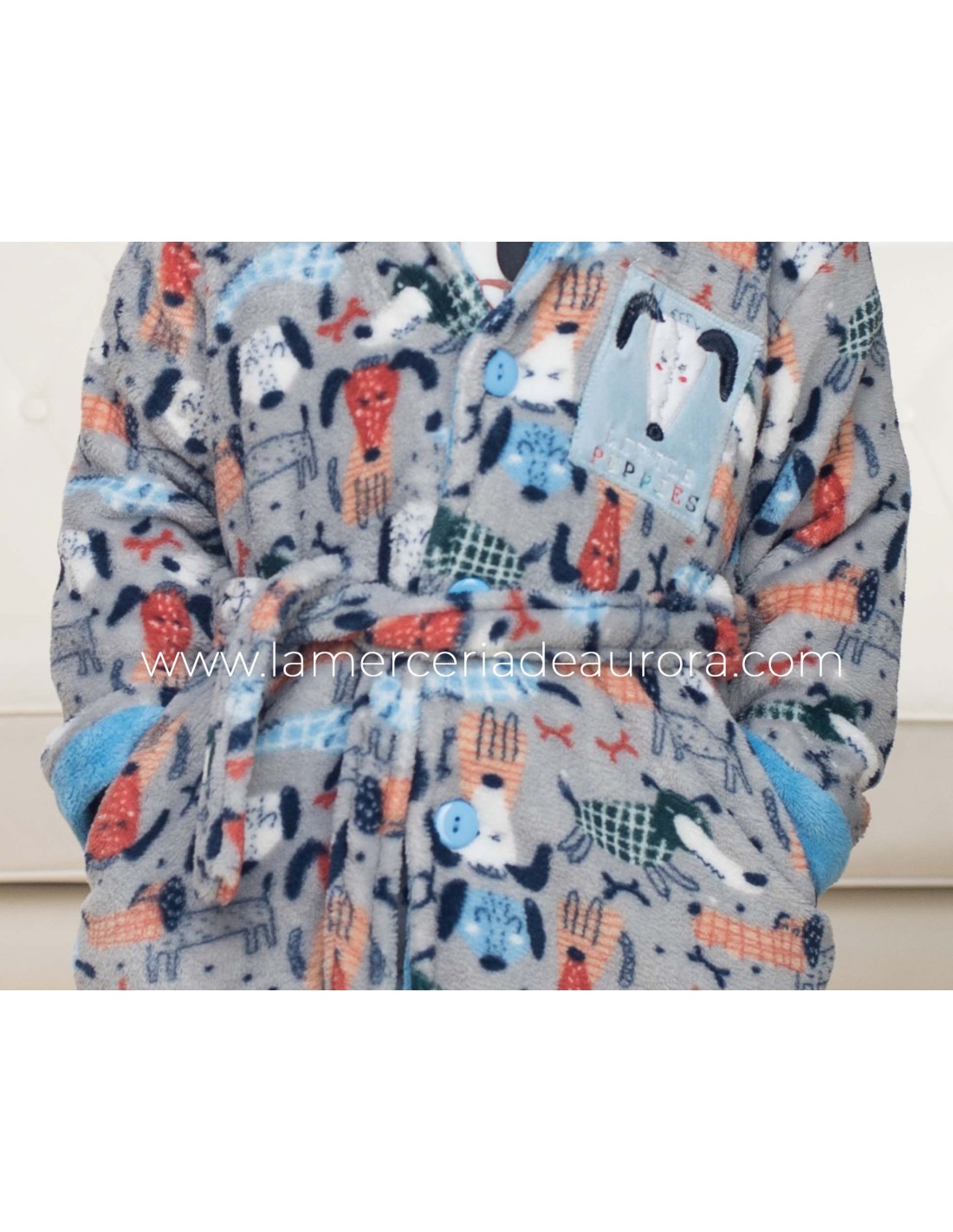 En color gris, estampada con perritos. Con cuello esmoquin, bolsillos laterales y cinturón. Se abrocha con botones.