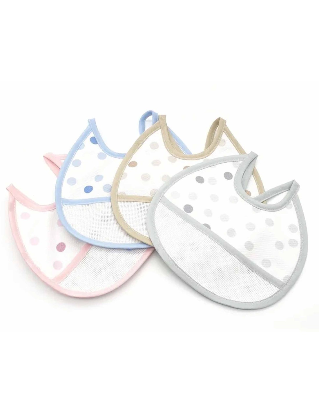 Babero redondo, en tejido piqué acolchado con lunares y bolsillo de tela panamá (Aida), para bordar.