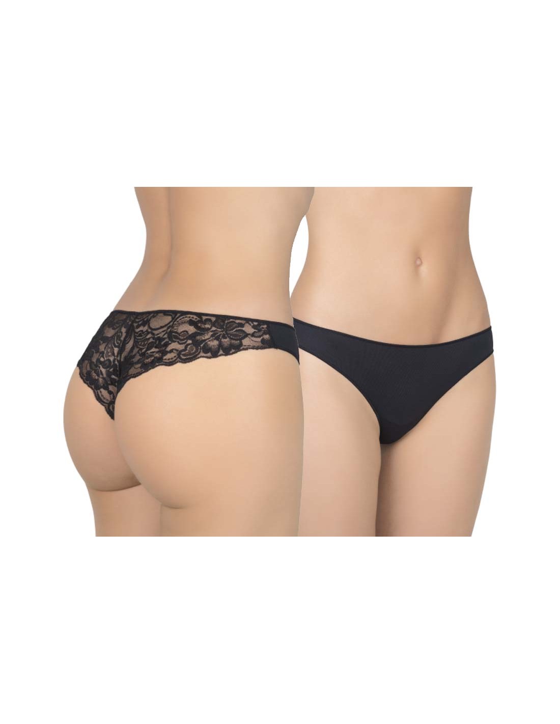 Braga tanga brasileña de finísima y elegante blonda en la parte trasera y tejido liso en la parte delantera.