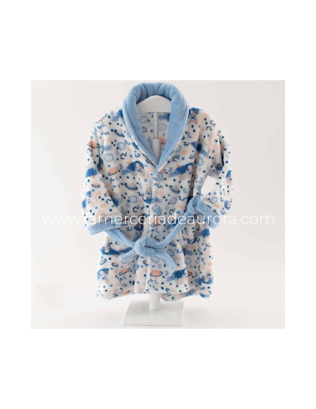 En blanco, estampada con cohetes, planetas y estrellas, en tonos azules y salmón. El cuello, puños y cinturón, en color azul liso.
