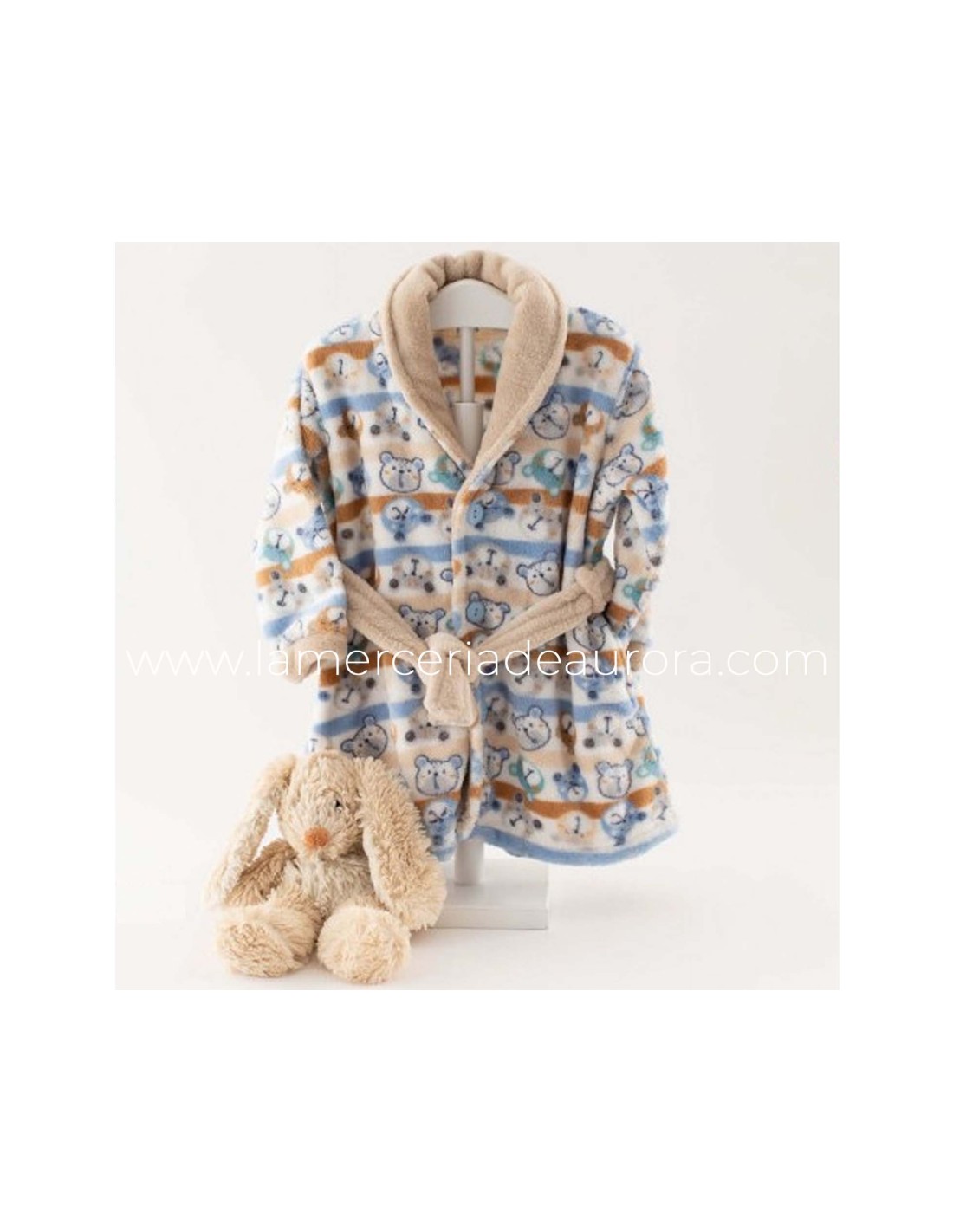 Batín bebé de tejido coralina, abotonada, con bolsillos laterales, cuello esmoquin y cinturón.