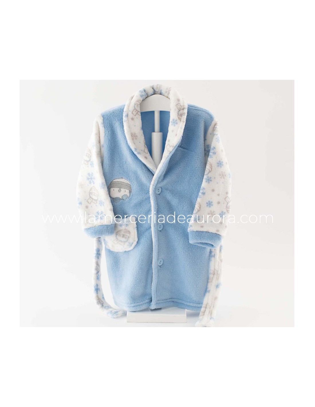 En color azul, con el puño, cuello, cinturón y bolsillo de parche en blanco con estrellitas. Aplique bordado con un simpático pingüino.