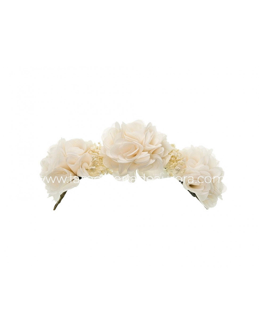 Las flores van sobre una base de alambre forrado, flexible, para adaptarse a la forma que se le quiera dar en el peinado. Los extremos van terminados en redondo, para colocar las horquillas.