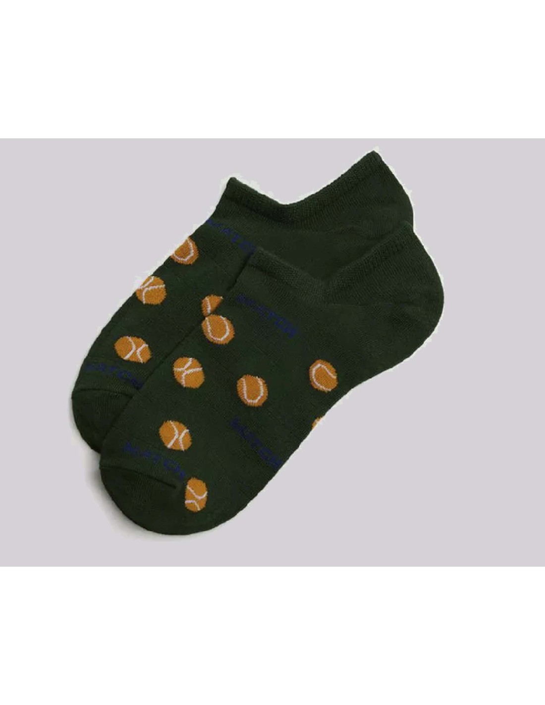 Calcetines invisibles, para hombre, en color verde caza, con pelotas de tenis en color ocre, combinado con blanco.