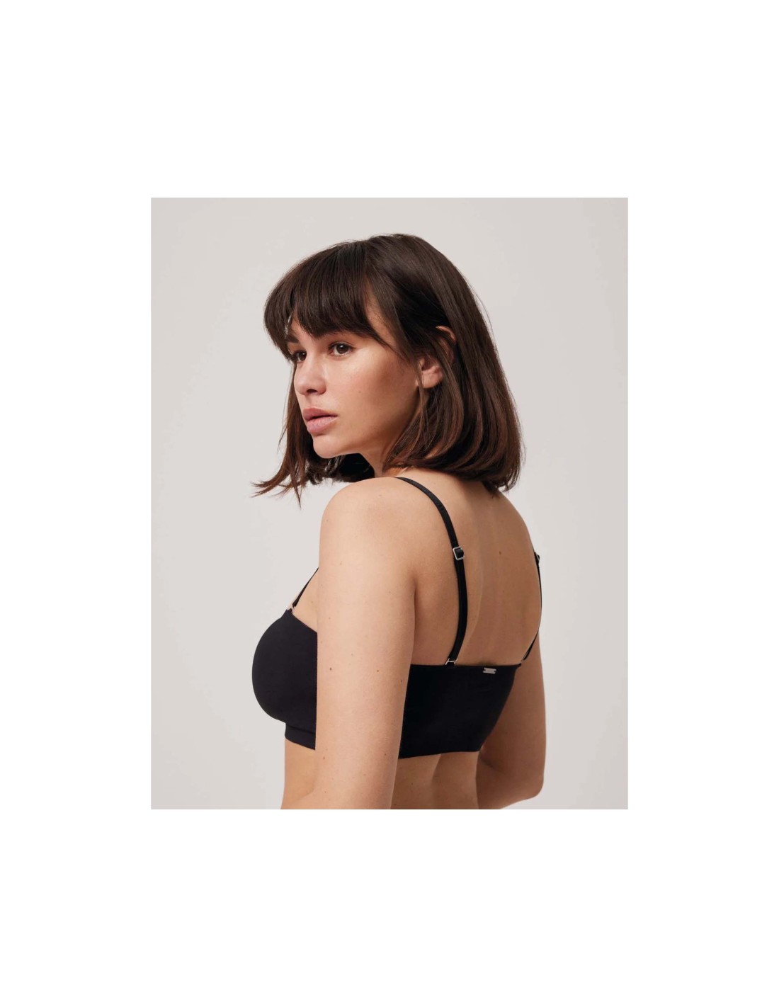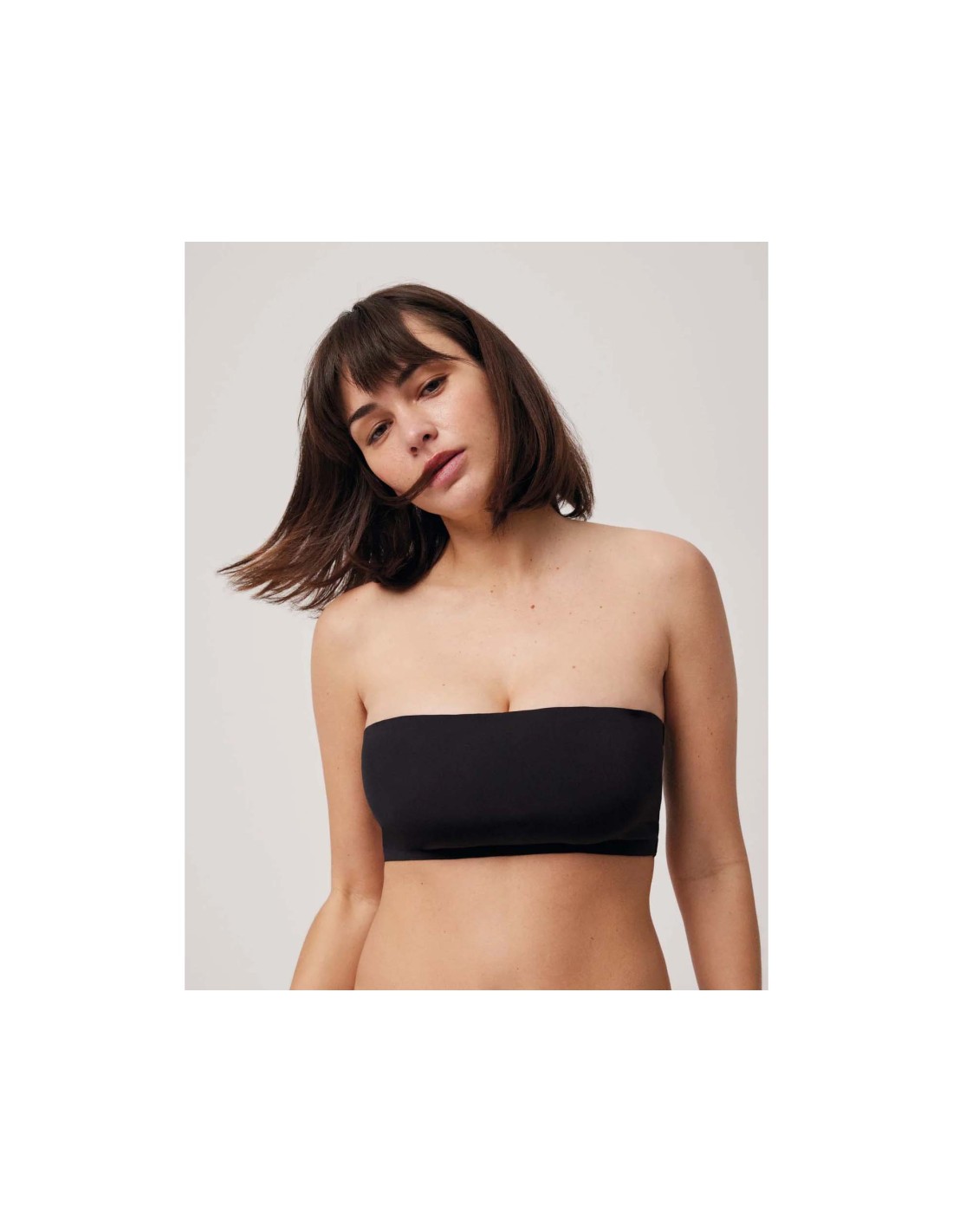 Sujetador estilo bandeau, en tejido liso, con costuras (sólo en los laterales) y acabado liso.