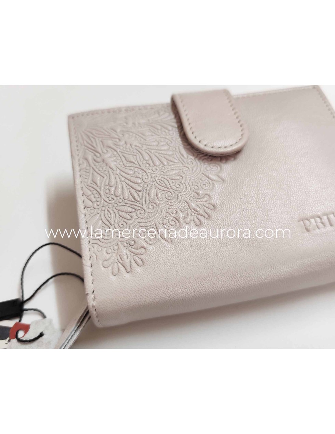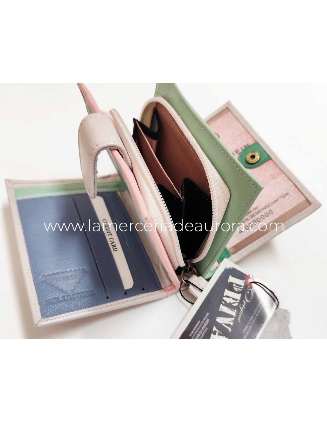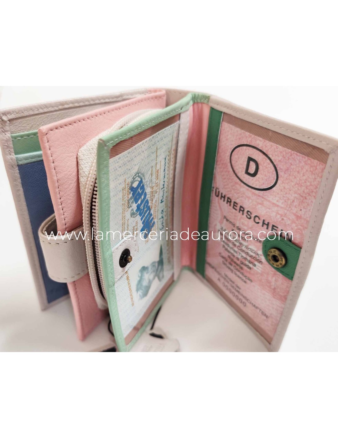 Cartera billetera de piel, en color crudo, combinado en su interior con colores verde, rosa, turquesa y azul.