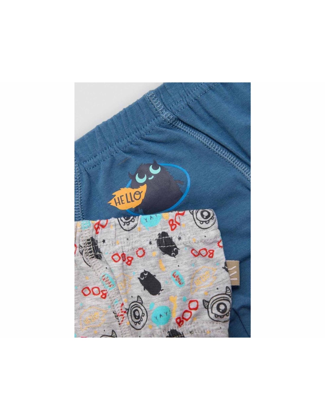 Uno de los slip, en gris vigoré, estampado con monstruos y texto en colores azul marino, turquesa, rojo y vainilla. El otro en azul marino, con un monstruo y el texto "hello" en la parte central.