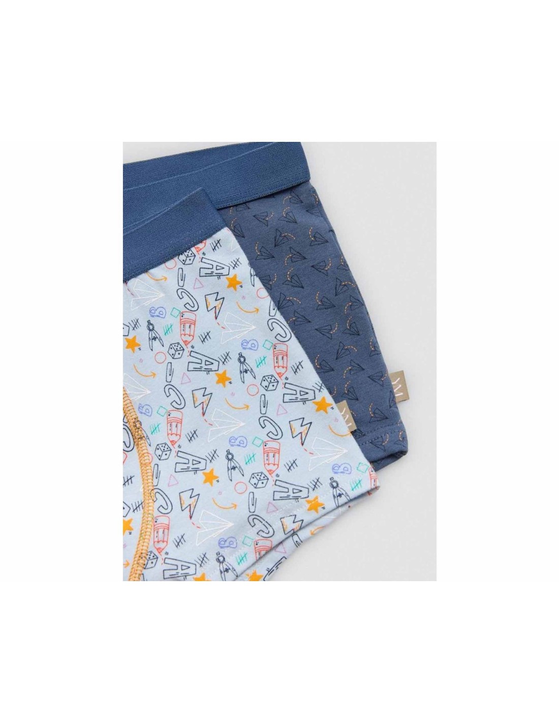 El pack contiene un en azul marino, totalmente estampado con AVIONES DE PAPEL, y otro en azul celeste, totalmente estampado con LETRAS y artículos de MATERIAL ESCOLAR.