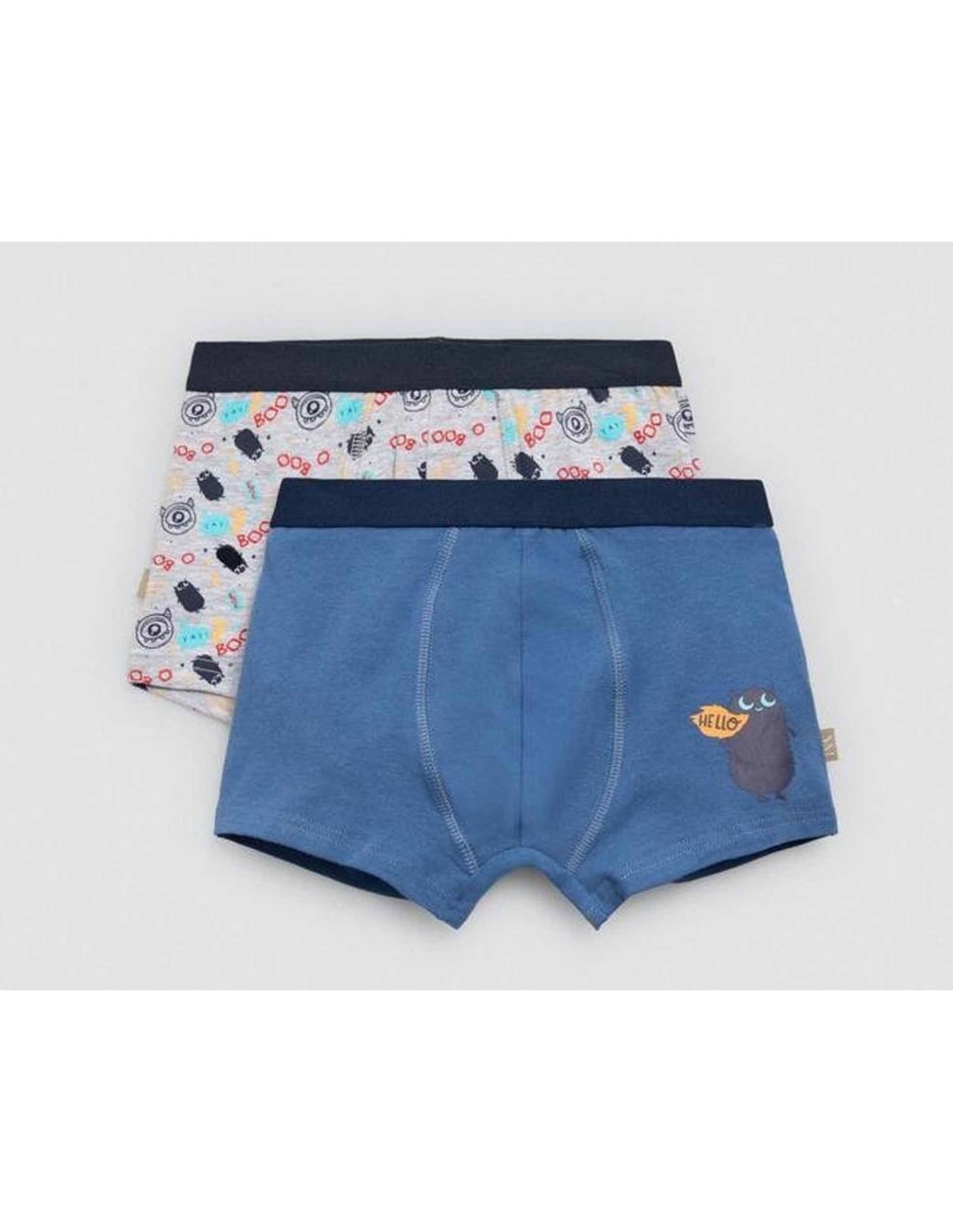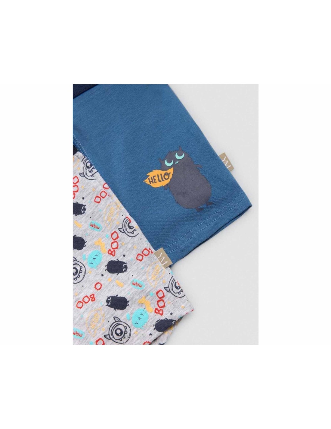 Uno de los bóxer, en gris vigoré, estampado con monstruos y texto en colores azul marino, turquesa, rojo y vainilla. El otro en azul marino, con un monstruo y el texto "hello" en un lateral.