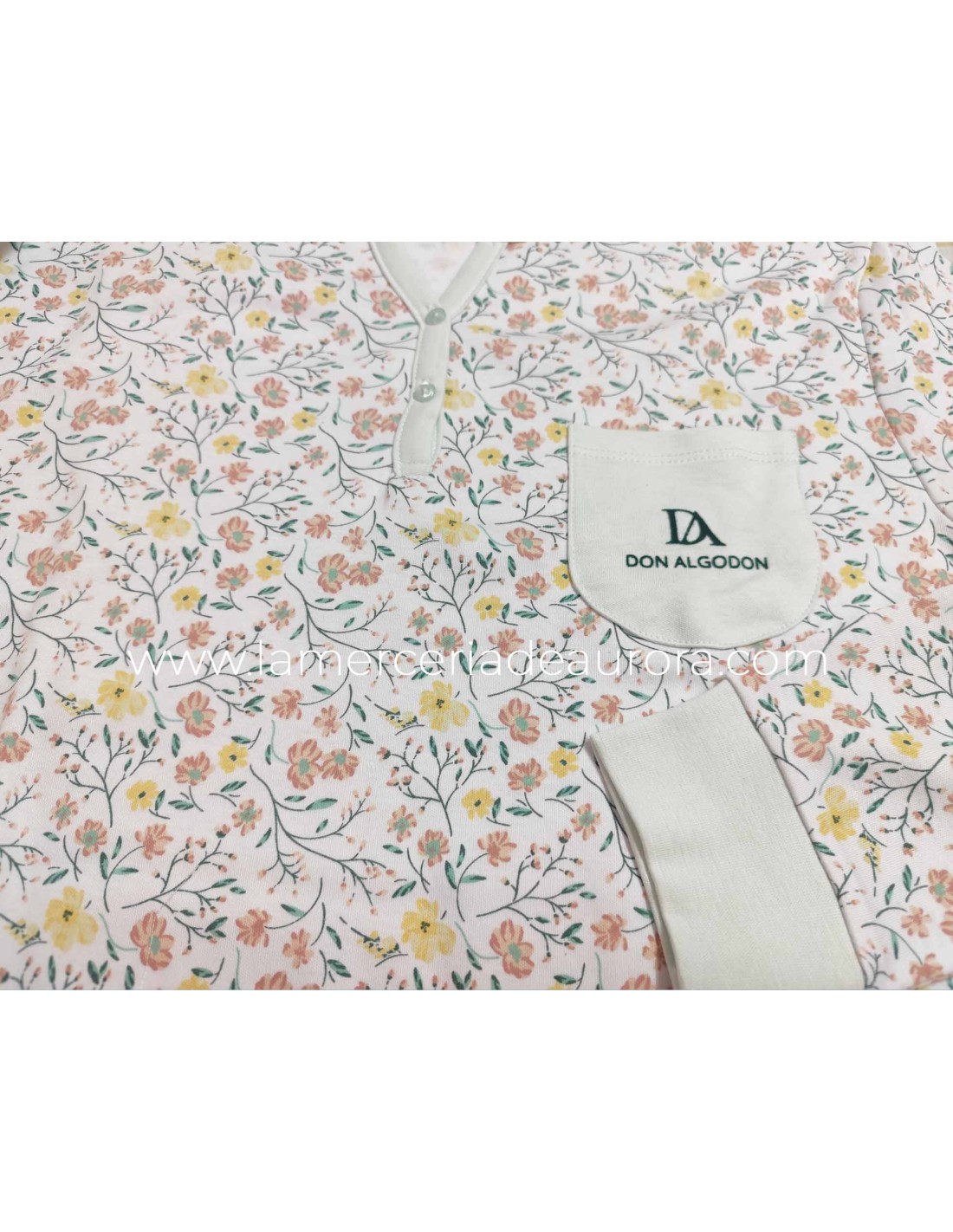 En color blanco estampado liberty con flores en colores: amarillo, naranja, teja y verde. Cuello con tapeta y botones, rematado en verde claro. Puños en las mangas, en color verde claro.
