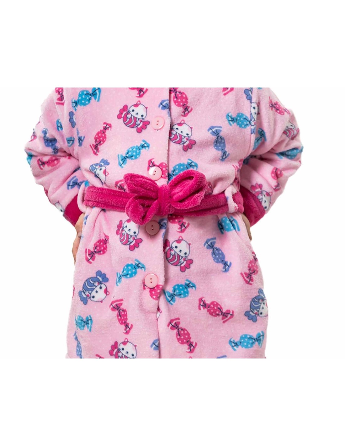 En color rosa, estampada con deliciosos caramelos en fucsia, turquesa y azul. Algunos de los caramelos llevan la cara de una gatita.