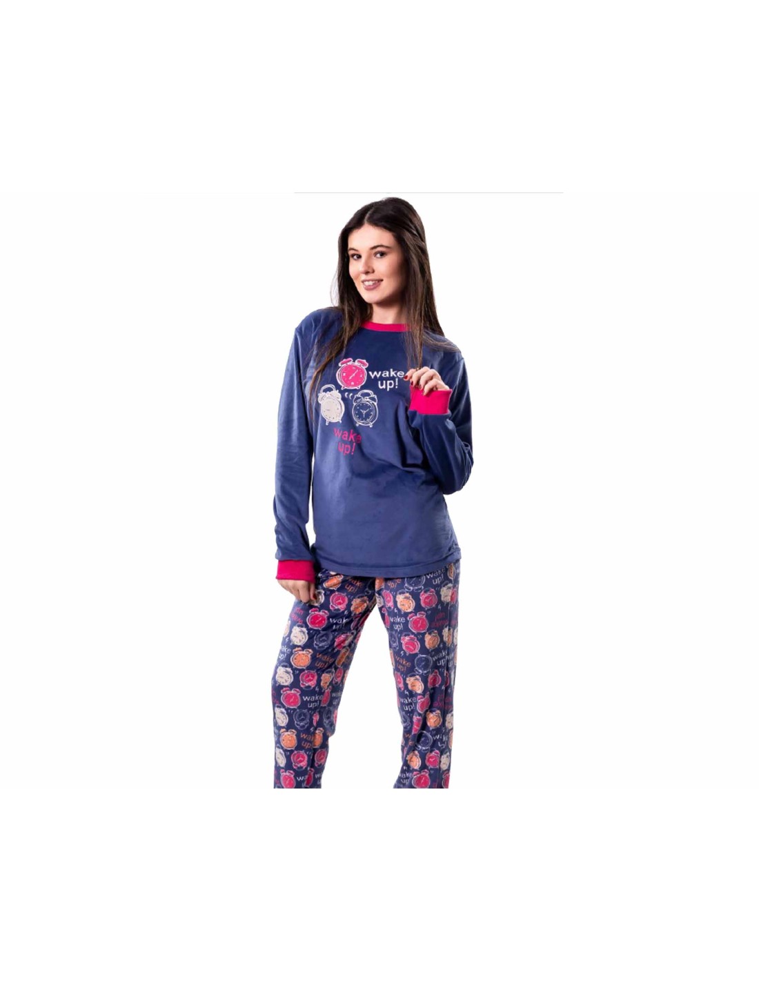 Camiseta en azul marino, estampada en la parte delantera con tres relojes despertador, y el texto wake up!. Con cuello redondo, puños en camiseta, en color fucsia.