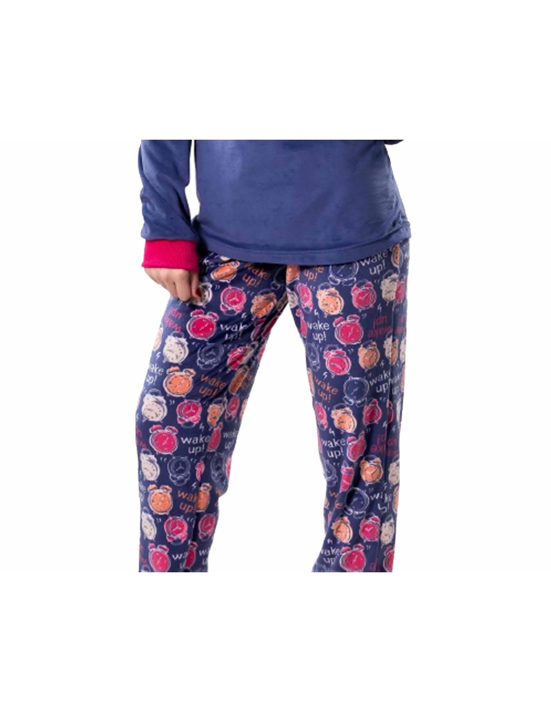 Pantalón con goma en la cintura y cordón decorativo y de ajuste. Totalmente estampado con relojes despertador en colores beige, naranja y fucsia y el mismo texto de la camiseta. Puños en la parte inferior en fucsia.