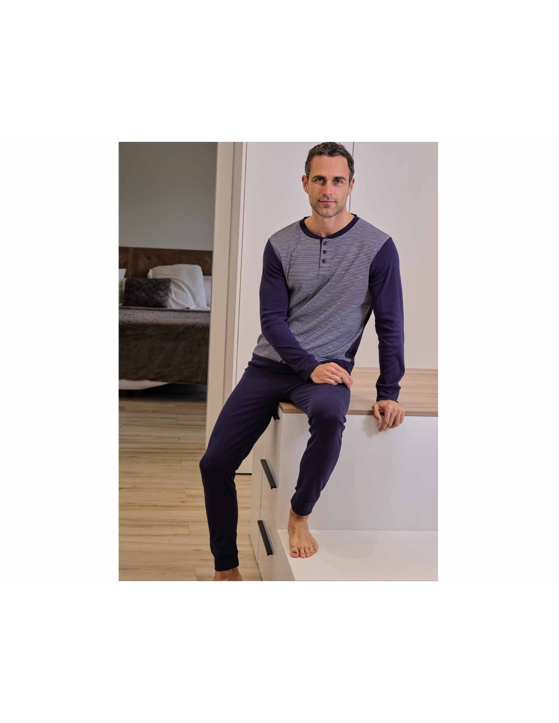 Pijama largo para hombre en tejido interlock (punto camiseta gruesa), ideal otoño-invierno.