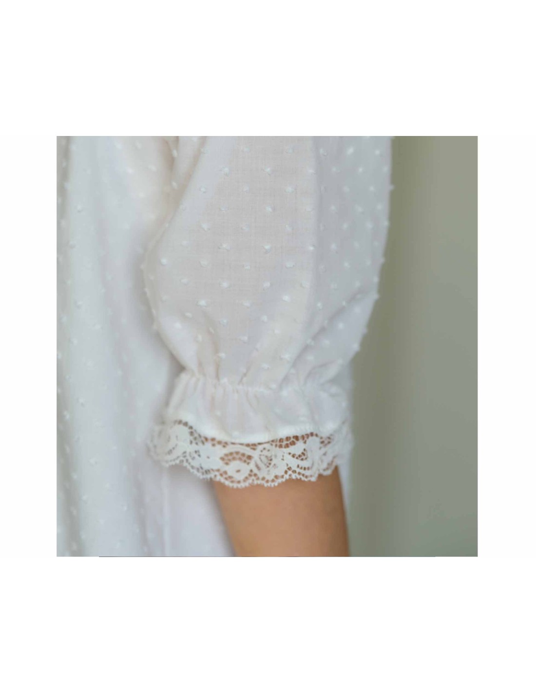 Detalle de encaje en la parte delantera, y en el final de las mangas. Esa parte delantera, aproximadamente a la altura del pecho, queda ligeramente fruncida.