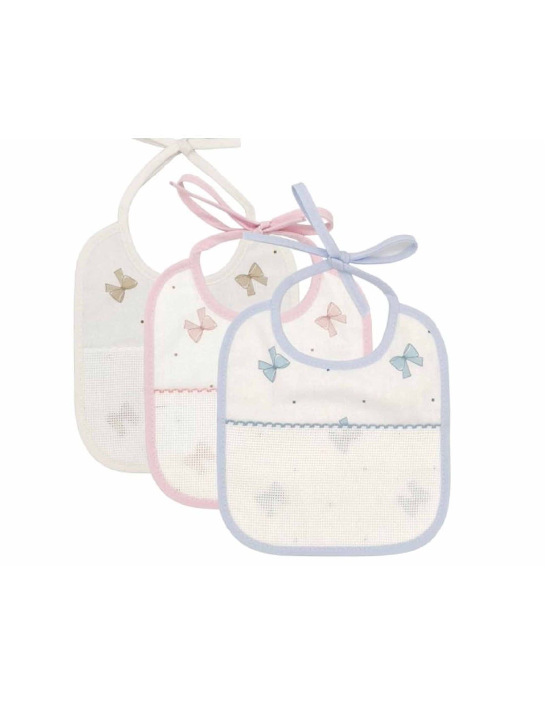 Bordes y cintas de atar en color azul, rosa y blanco, dependiendo del modelo elegido.