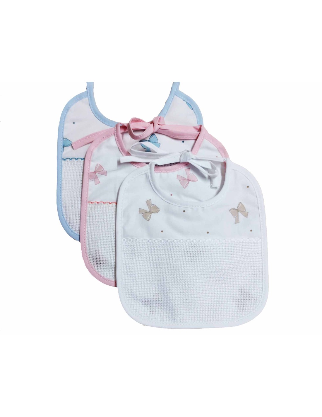 Con bolsillo de tejido Aida, color blanco, para que puedas personalizarlo con letras, dibujos... Tiene una altura de 9cm. Este bolsillo, se puede coser a la base del babero una vez realizada la labor.