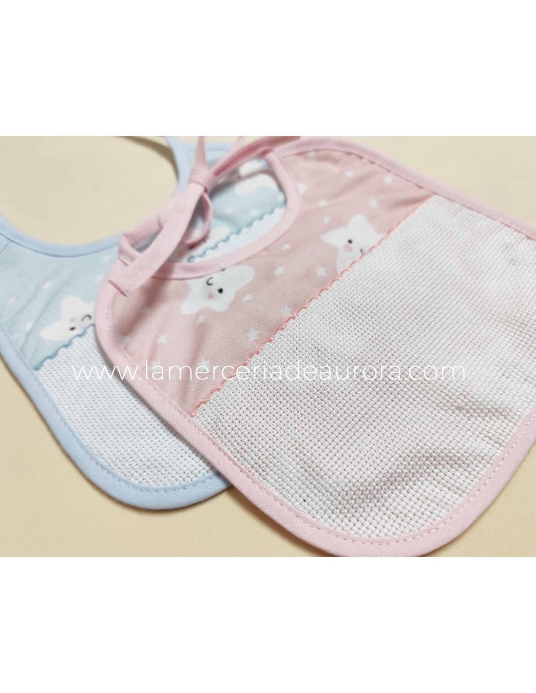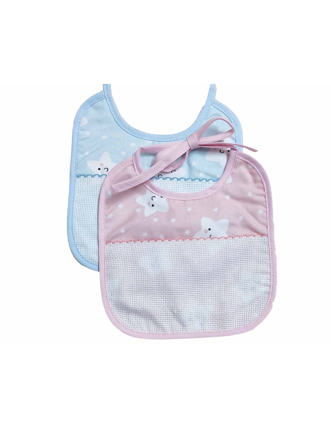 Baberos bebé, estampados con alegres estrellas blancas, sobre fondo celeste o rosa, dependiendo del modelo elegido.