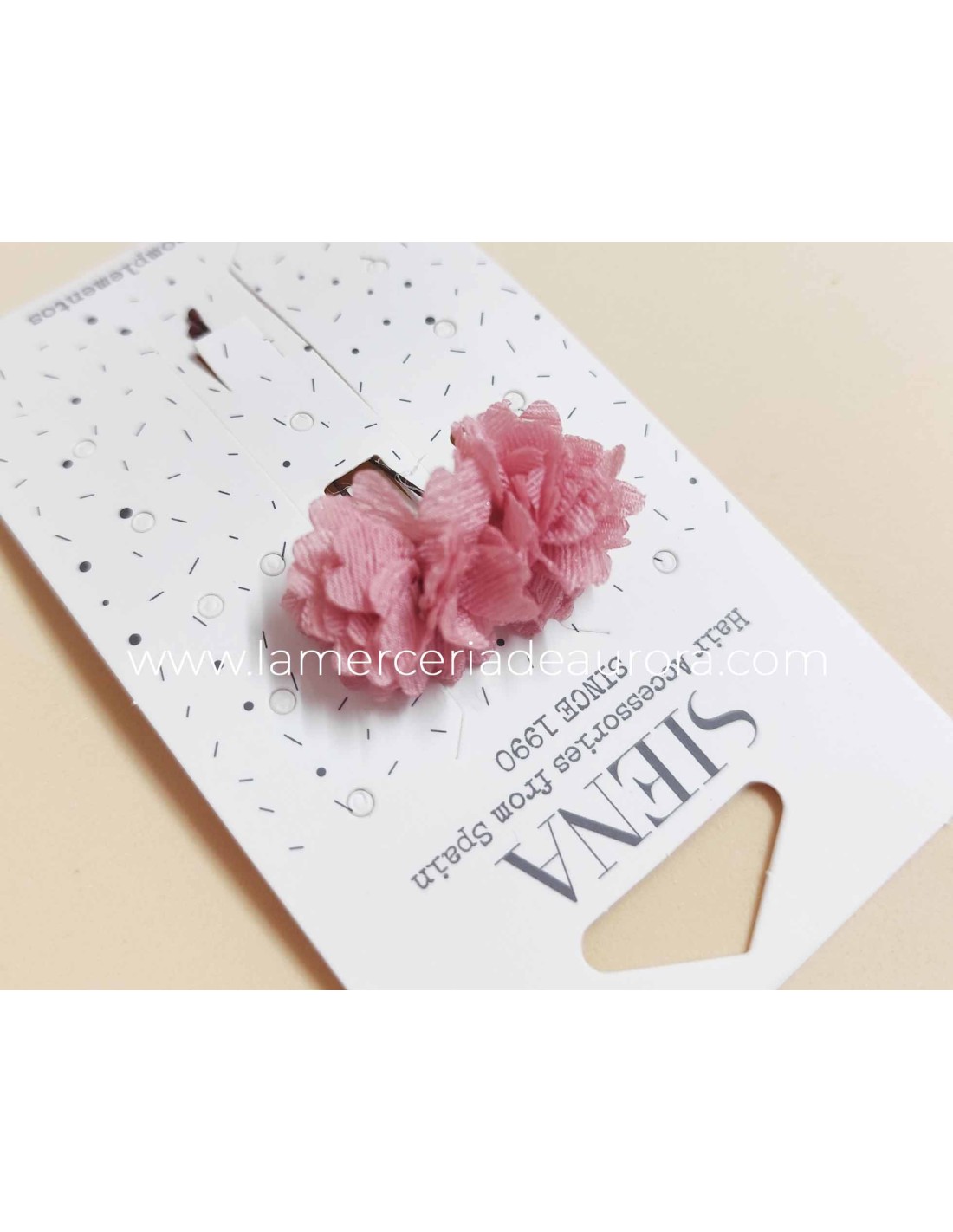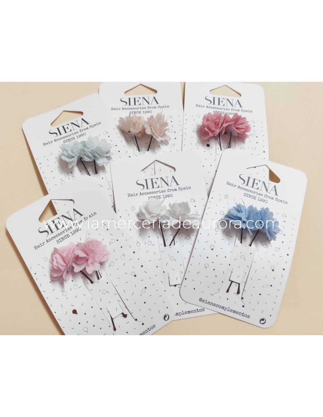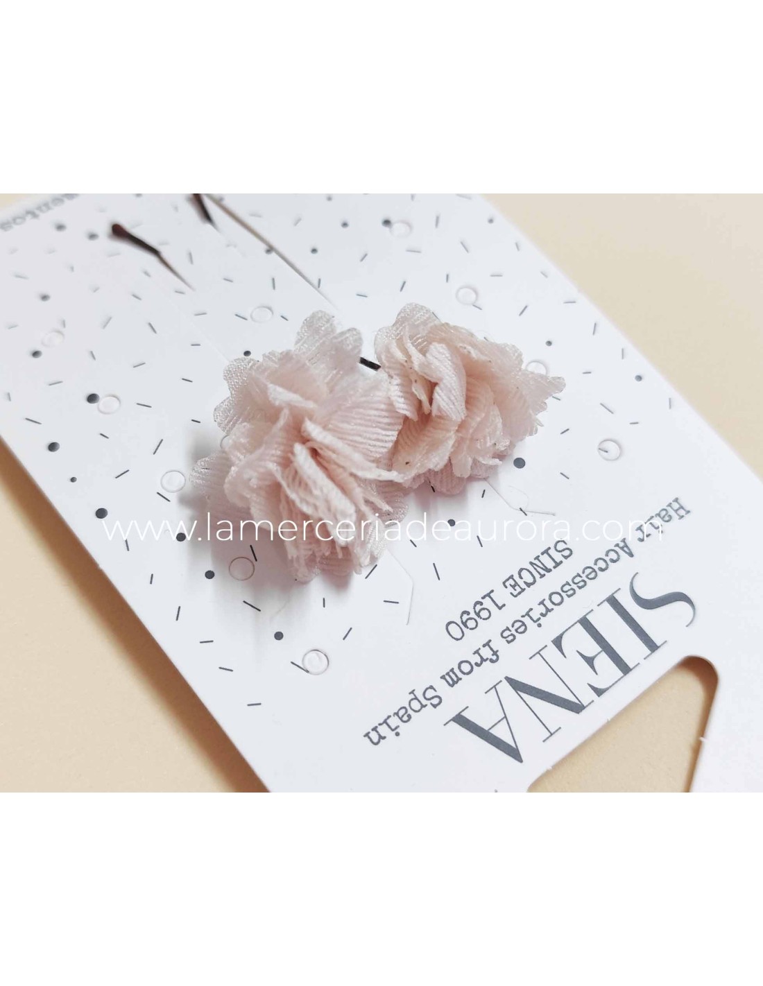 2 pinchos para recogidos, con flores de tela tipo tul rayado.