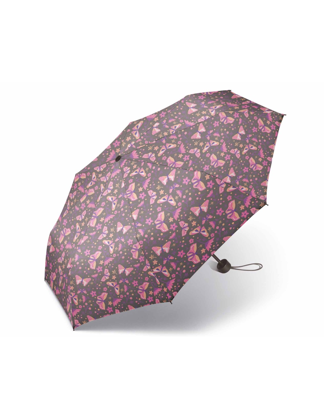 Paraguas plegable juvenil, estampado sobre fondo marrón oscuro, con MARIPOSAS y FLORES, en colores rosa, azul y huevo.