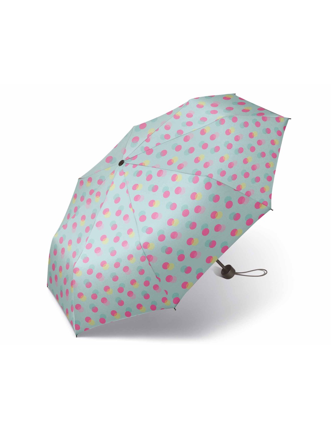 Paraguas plegable juvenil, estampado sobre fondo verde agua, con TOPOS en fucsia y amarillo.