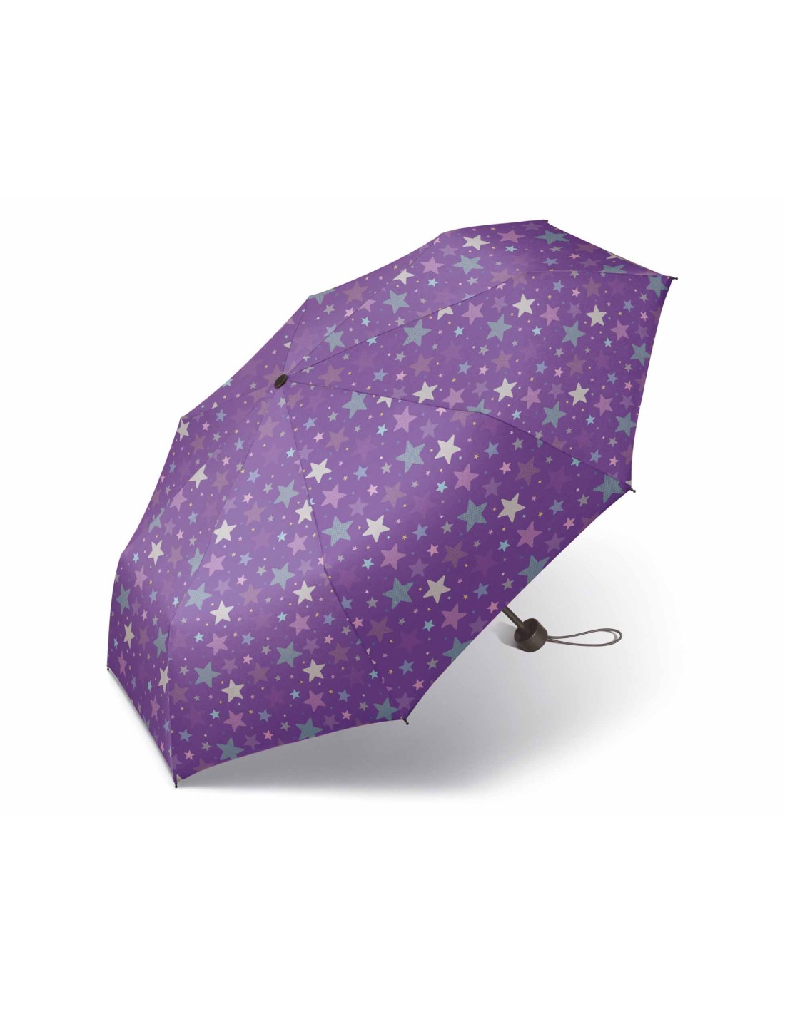 Paraguas plegable juvenil, estampado sobre fondo morado, con ESTRELLAS, en gris, rosa, azul, amarillo y verde.