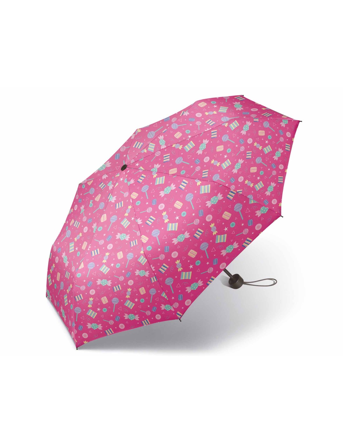 Paraguas plegable juvenil, estampado sobre fondo fucsia, con diferentes y apetitosas CHUCHERÍAS de colores.