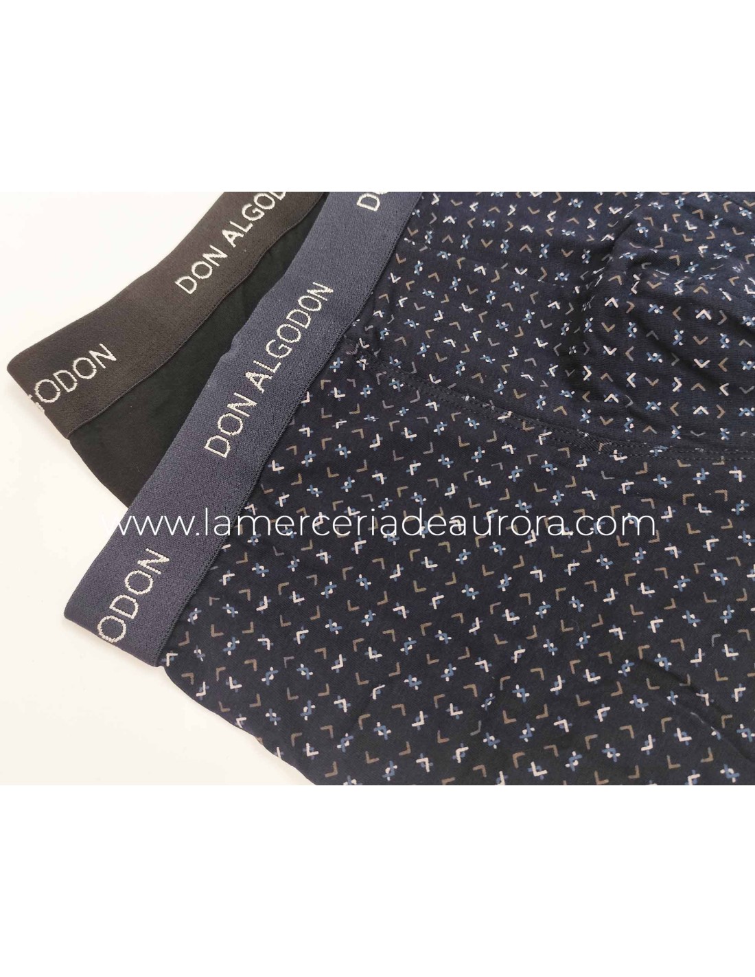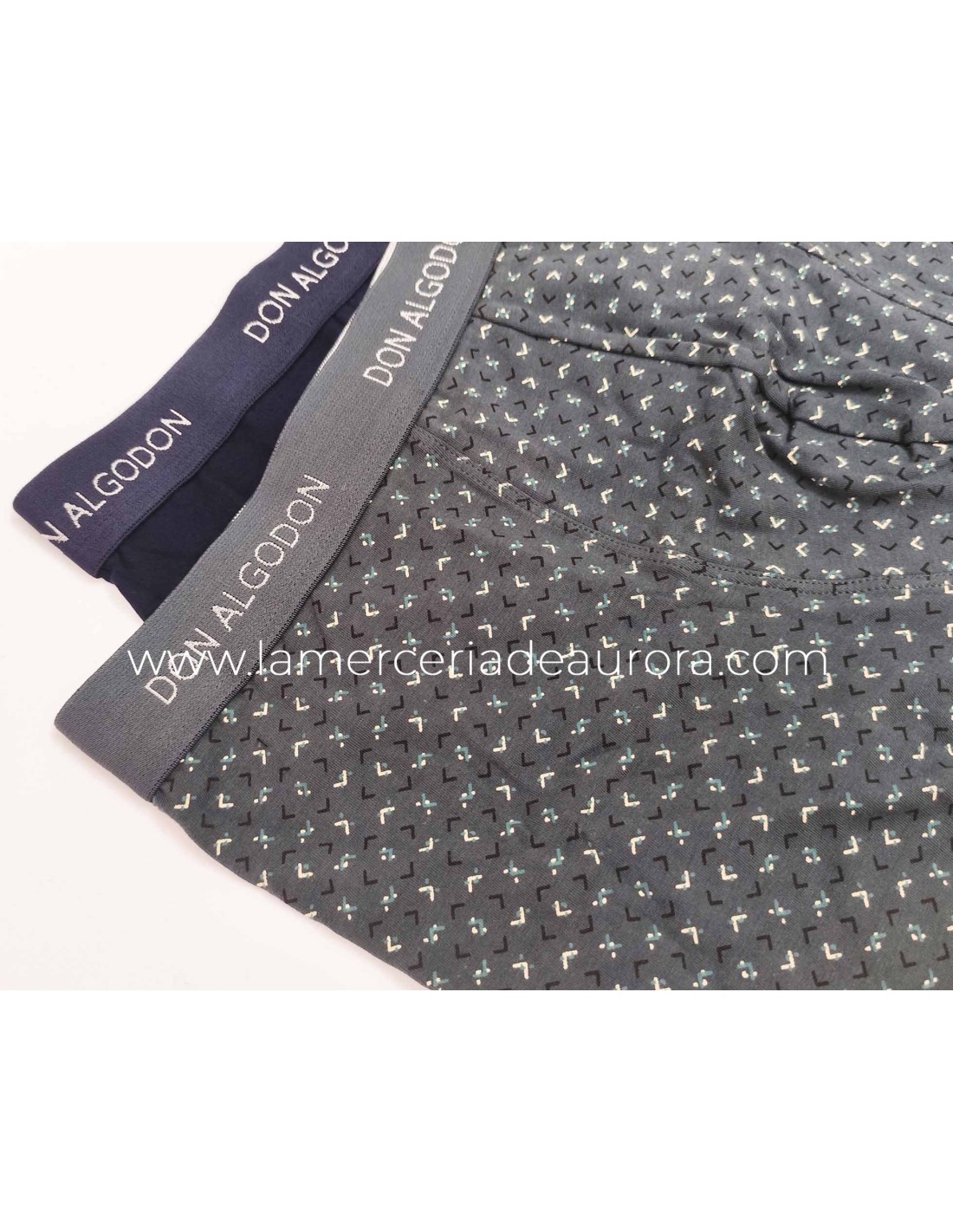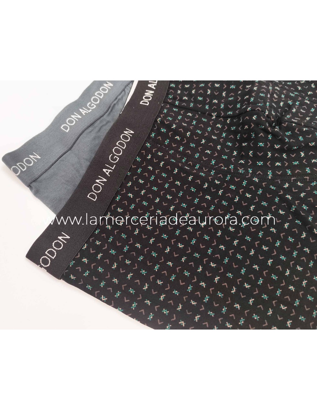 El pack contiene dos calzoncillos, uno en color liso y el otro estampado fantasía, con un elegante diseño geométrico.