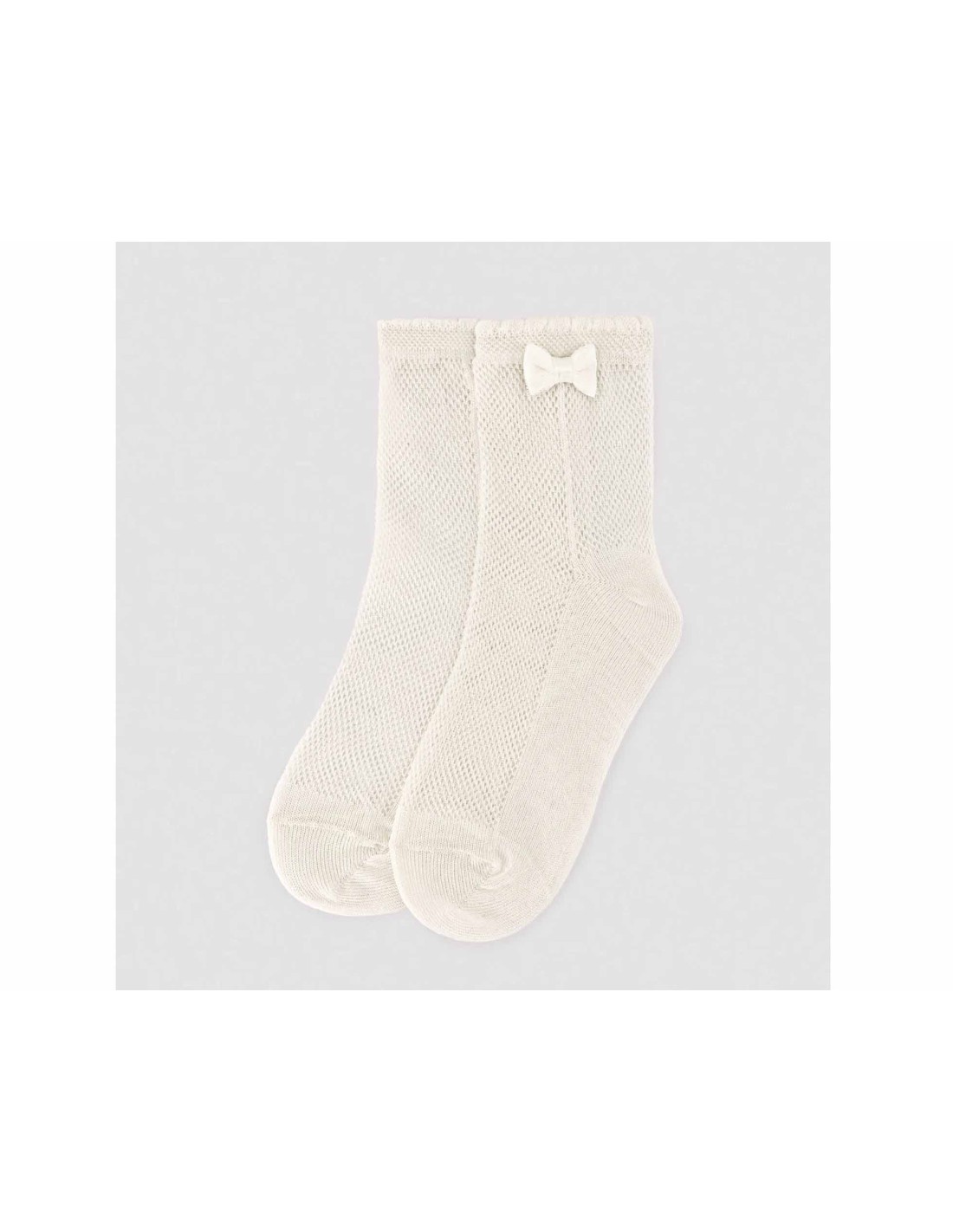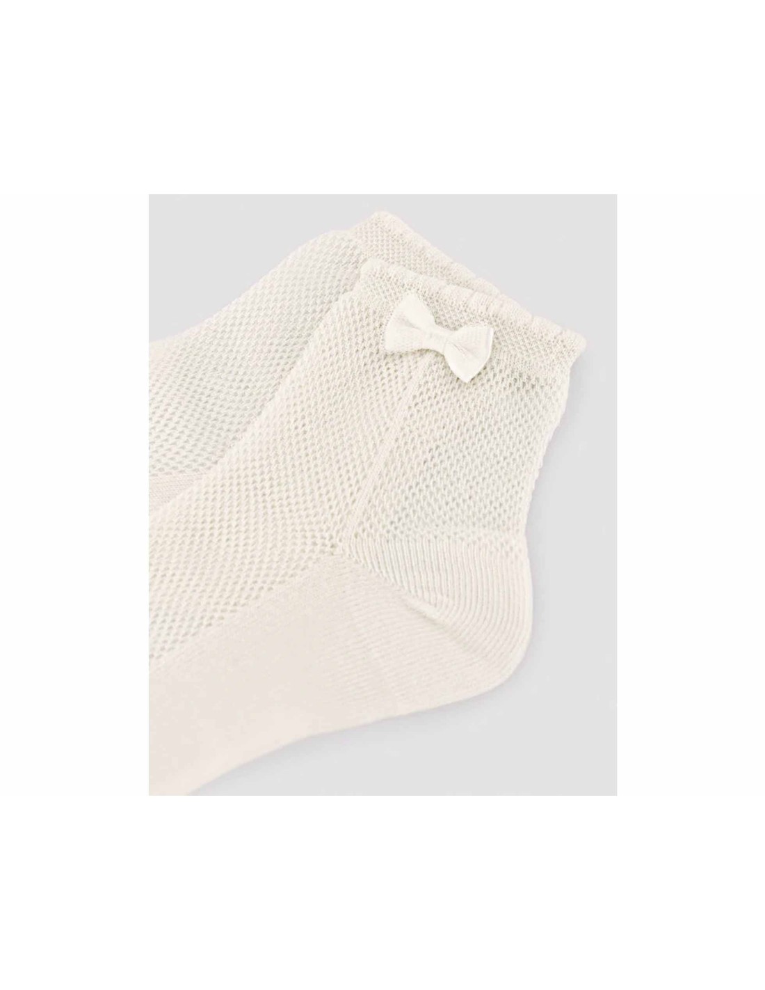 Calcetines tobilleros para niña, en color marfil, calado tipo red, con detalle de lacito en el lado exterior.