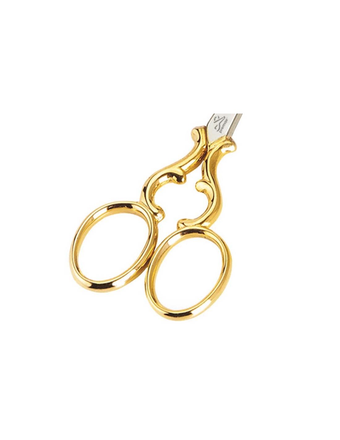 Elegante tijera para bordar con mangos fantasía y punta recta, fabricada con acero al carbono niquelado y embellecida en los mangos con un baño dorado de 24 quilates.