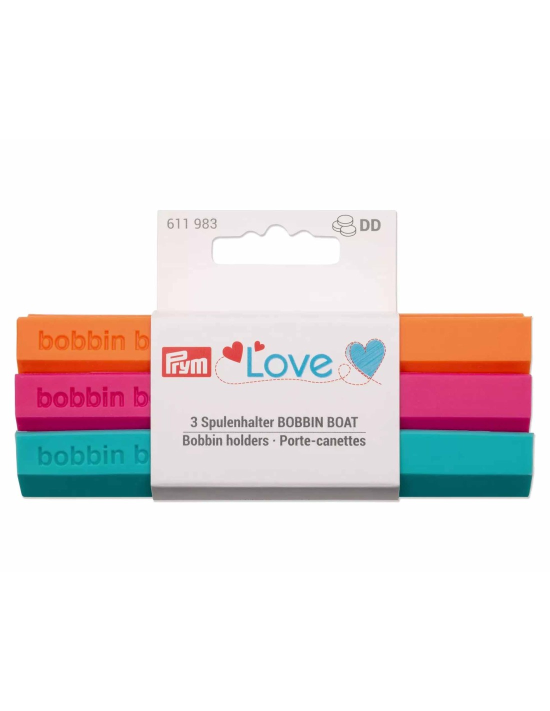 Set 3 portabobinas (canillas) en llamativos colores: naranja, fucsia y menta, de la colección PRYM LOVE.