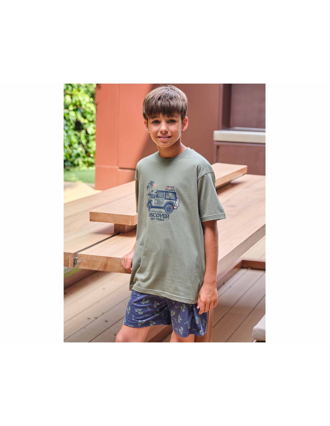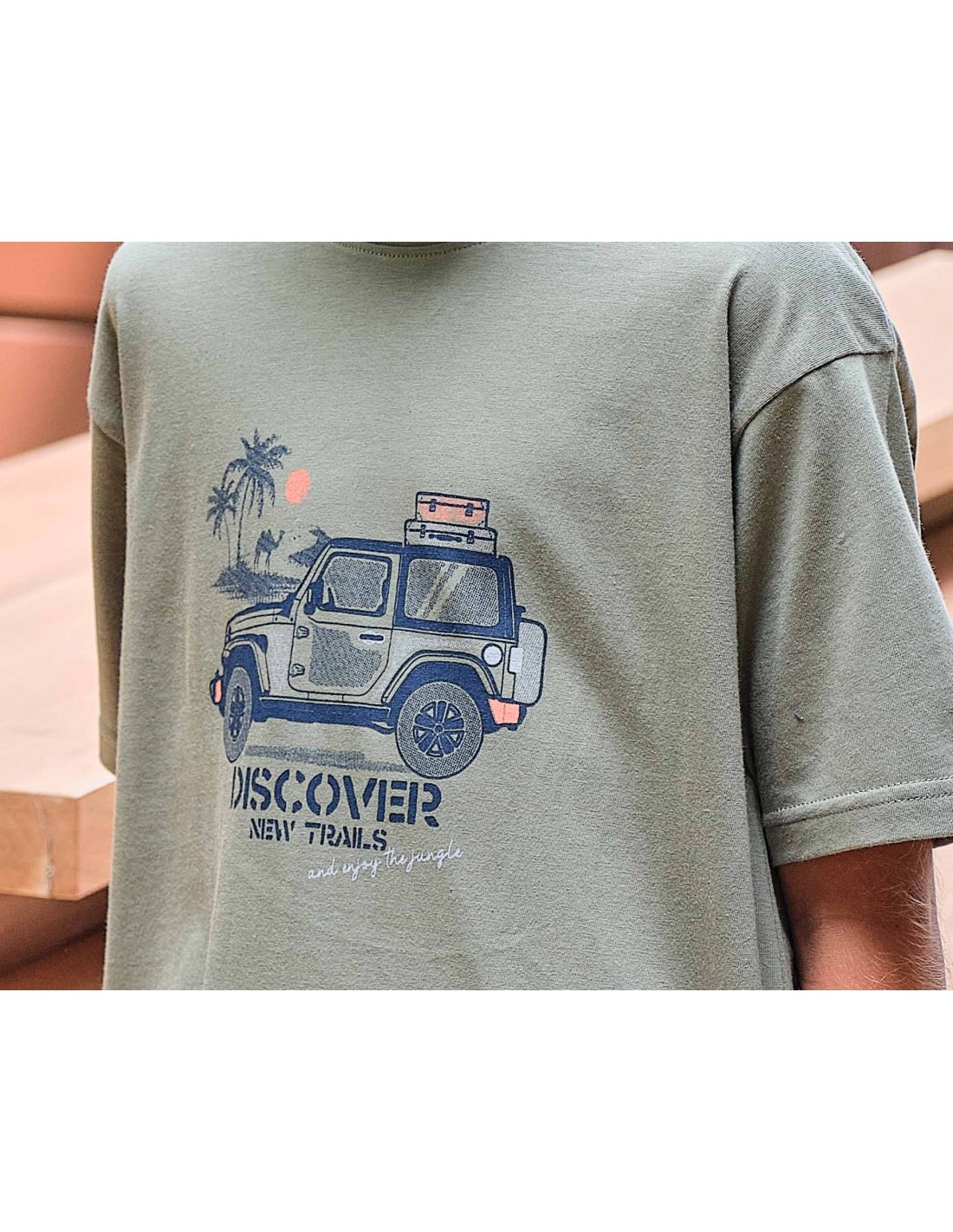 Camiseta de manga corta, con cuello redondo, en color verde militar. Estampado central con un jeep y el texto "DISCOVER NEW TRAILS, and enjoy the jungle".