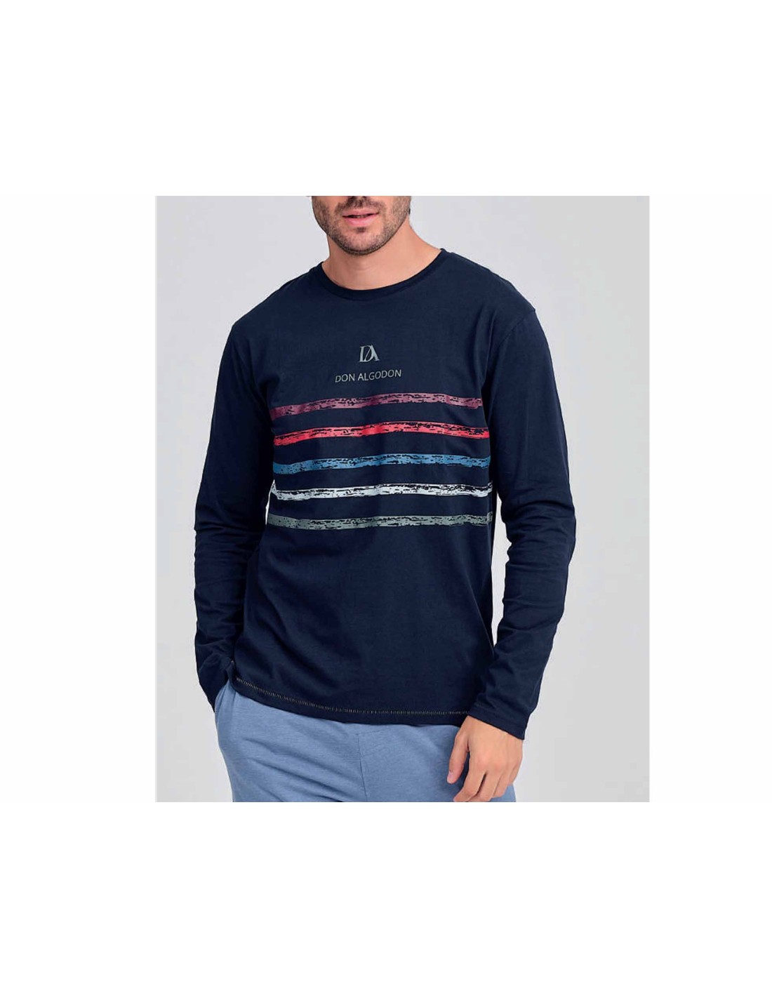 Camiseta en azul marino, con cuello redondo y puños en las mangas. Estampado central con un moderno y original diseño de cinco rayas irregulares en colores: vino, rojo, azul jeans, blanco y gris. Por encima de las rayas lleva estampado el logo de la marca.