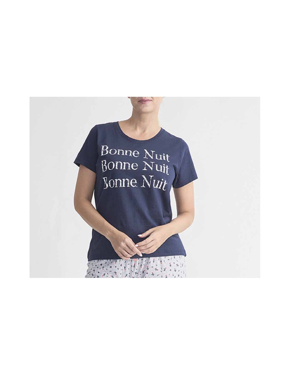 Camiseta de manga corta, con cuello redondo, en color azul marino. Estampado central con el texto: "Bonne nuit" (3 veces), con letras blancas rellenas de flores.