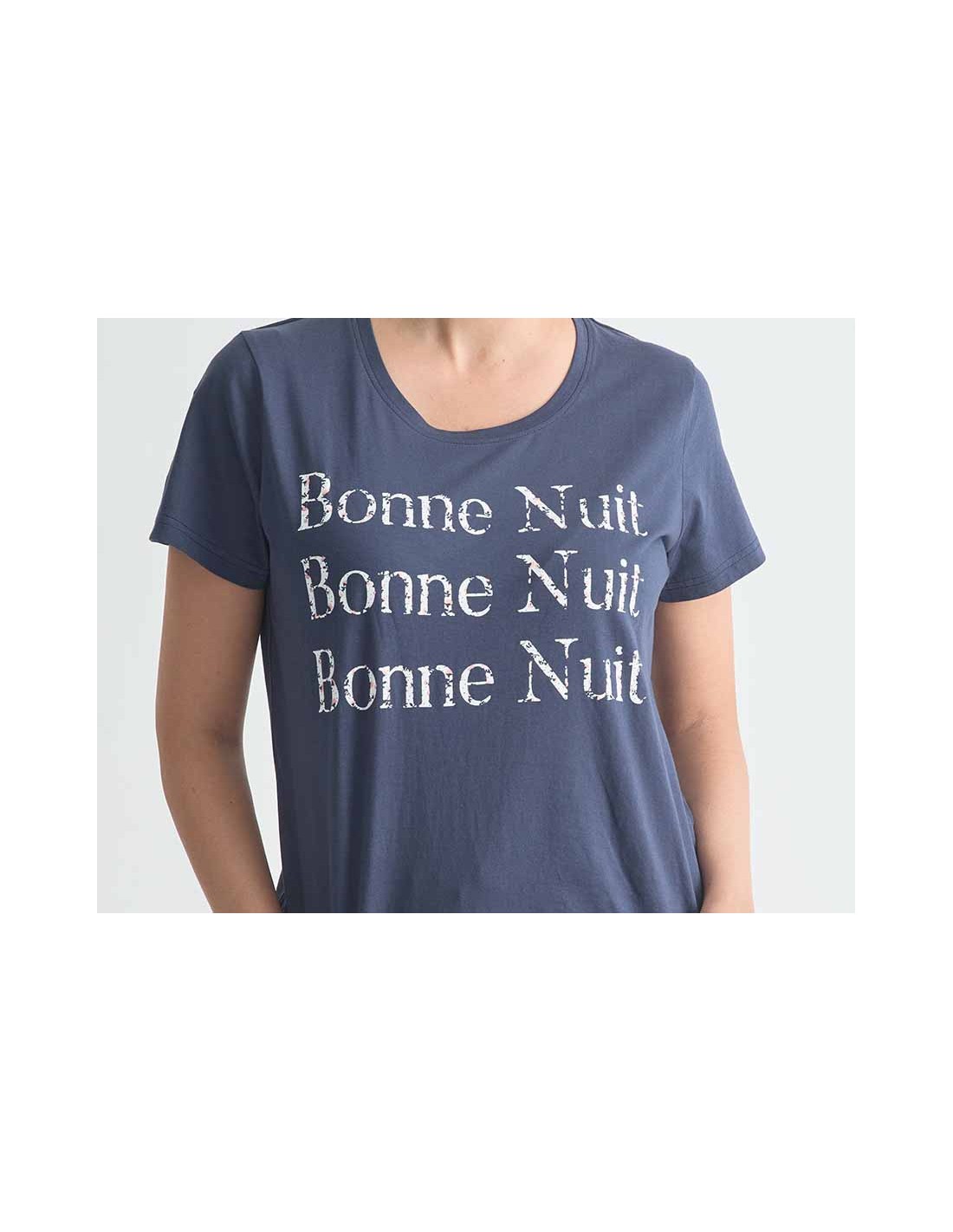 Camiseta de manga corta, con cuello redondo, en color azul marino. Estampado central con el texto: "Bonne nuit" (3 veces), con letras blancas rellenas de flores.