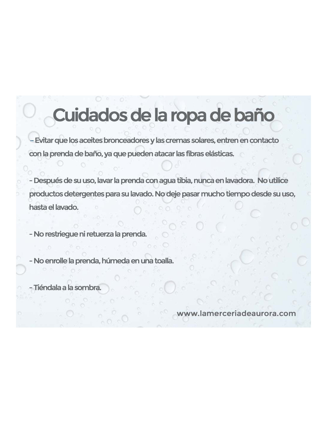 | La prenda de baño, es considerada una prenda muy delicada, que requiere unos cuidados especiales. Siga estrictamente todos los consejos del etiquetado. |