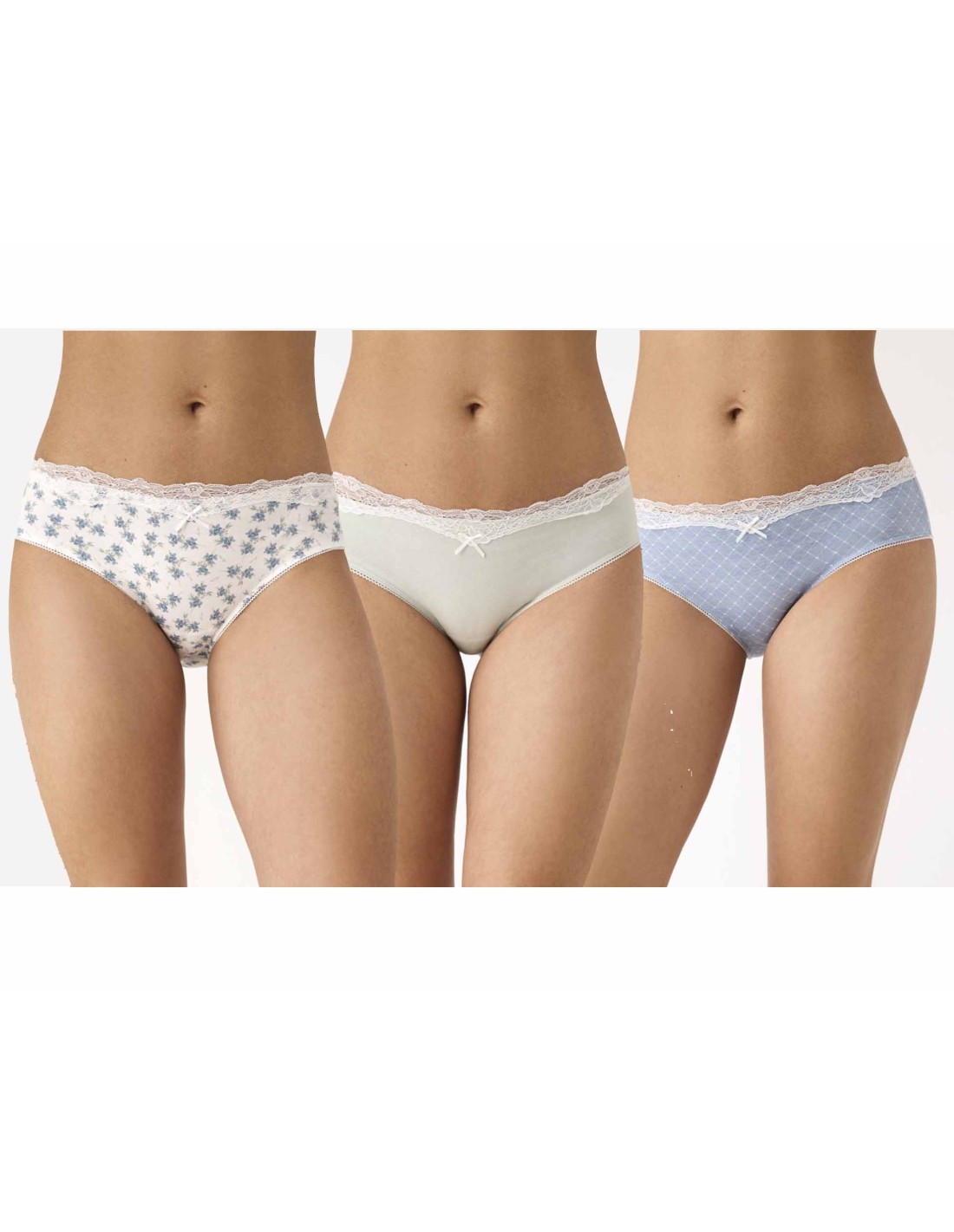 Pack 3 bragas, tipo MIDI, con dos bragas estampadas y una lisa. Todas ellas llevan detalle de suave blonda en la cintura.