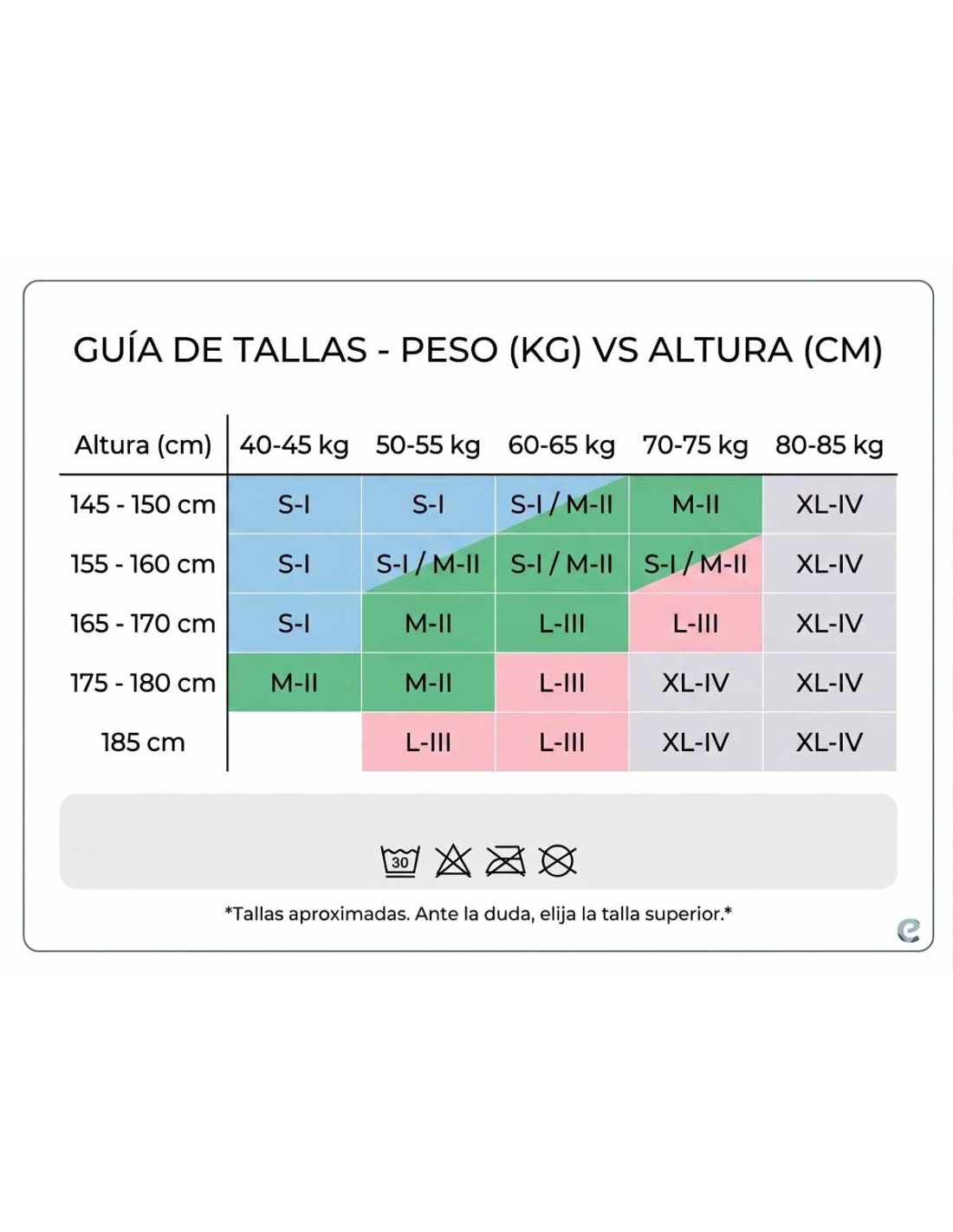 • Talla L-III: Para estaturas a partir de 165 cm con pesos entre 65-75 kg.